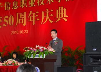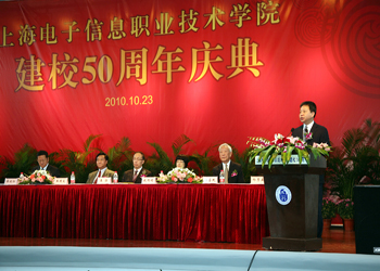 庆典大会上,上海市副市长沈晓明向学院50周年华诞表示热烈祝贺,并充分肯定了学院50年来的教学成果。他说,上海电子信息职业技术学院在半个世纪的发展历程中,始终坚持党的教育方针,以培养人才为己任,以社会需求为导向,培养了大批高素质职业技能型人才,为上海的经济建设和社会发展做出了巨大的贡献。他还祝贺上海电子信息职业技术学院在今年成功入选国家骨干高职院校建设单位。他表示目前上海市正在加快推进“四个率先”、加快建设“四个中心”和社会主义现代化国际大都市的宏伟事业,迫切需要包括电子信息等专业方面的各类职业技能人才。希望学院抓住机遇,乘势而上,继续深化教育教学改革,不断探索,创新形式,为经济社会培养更多更好的人才。