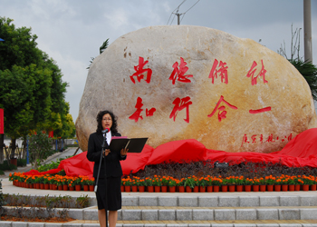 在揭幕仪式上,学院党委书记、院长杨秀英发表了热情洋溢的讲话,她说,校训石是学院精神的核心载体。校训是学院文化建设的重要内容,是对学院精神内核的高度集成和概括。回首50年发展历程,学院七迁校址、七易校名,硬是凭借一腔永不言弃、执着坚守的热血激情,走出了一条自力更生、勤勉进取的坚实道路,也凝铸形成了“自强不息,开拓创新”的学院精神和“尚德修能,知行合一”的校训。这既是我院几代师生员工崇德尚行、务实践行的真实写照,又是新的历史时期全院师生员工继续前行的航标灯塔。她表示,校训石的诞生,是校园文化建设里程碑意义的创举。它必将为学院未来发展提供不竭的动力,为学院人提供永久的精神皈依。它是校魂,是学院精神的辐射源和策源地,是每一名学子的座右铭,将永远屹立在美丽的校园,永远屹立在我们心中。杨院长要求全院教职员工要秉承校训,开创未来。她说,站在新的历史起点,我们将继续传承和弘扬校训精神,自觉转化为办学追求,成为团结和引领全体党员、师生员工思想行为的精神航标,为加快建成优势突出、特色鲜明、有效带动的国家骨干高等职业院校,为培养造就社会主义事业合格建设者和可靠接班人而努力奋斗!