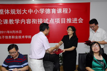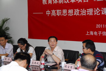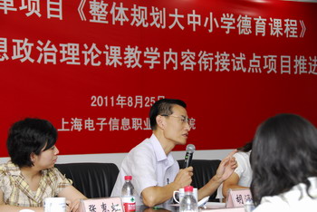 “中高职思想政治理论课教学内容衔接试点”项目推进会,2011 年8 月25 日上午9 点在我院奉贤校区中德B 楼205室举行。该项目是市教委关于教育体制改革《 整体规划大中小学德育课程》的子项目,我院在成功申请到这一项目后,立即成立了试点项目组,由徐松鹤副院长任组长、思政部主骨干教师参加,还有兄弟院校有经验的思政课和德育课教师参与。学院党政领导十分重视,对项目的实施提出了明确的要求。项目组自启动以来做了大量前期准备工作,第一阶段的研究也全面展开,为下一步工作打下扎实基础。今天,项目组迎来了市教委领导及有关专家的面对面直接指导。