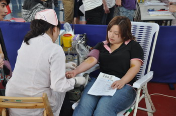 上午8:30,第一批献血的同学们准时来到室内体育场。在完成了表格填写、身份核对、血样抽取和血压测量等准备工作后,便陆续进入献血区开始献血。大家面带笑容、心情放松地伸出温热的手臂,让鲜红的血液缓缓流入采血袋,用自己的热血书写着一曲生命的赞歌。