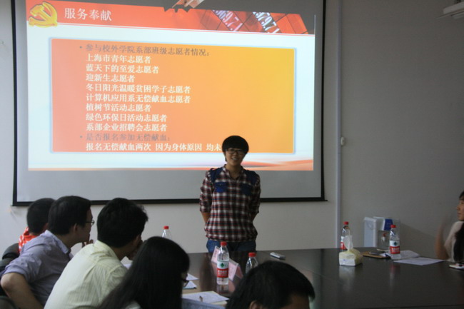 9月6日,“计算机应用系学生党员发展对象答辩会”在H1-313会议室举行,14名学生入党积极分子参加了答辩,会议由谌明举同志主持。组织发展对象答辩会改变了传统的支委会(或支委扩大会)讨论确定学生党员发展对象的传统模式,扩大了民主参与范围,答辩评委由支委、教师党员(包括专任教师和辅导员)、学生党员、普通学生代表等34名多类别人员组成,这样的评委构成增加了专任教师对学生的评价和发言权、增加了学生对学生的评价(包括普通学生对入党积极分子的评价),同时也让其他学生更加清晰组织对一个学生党员的要求,明确了努力的方向,增强了党组织的凝聚力和吸引力。
