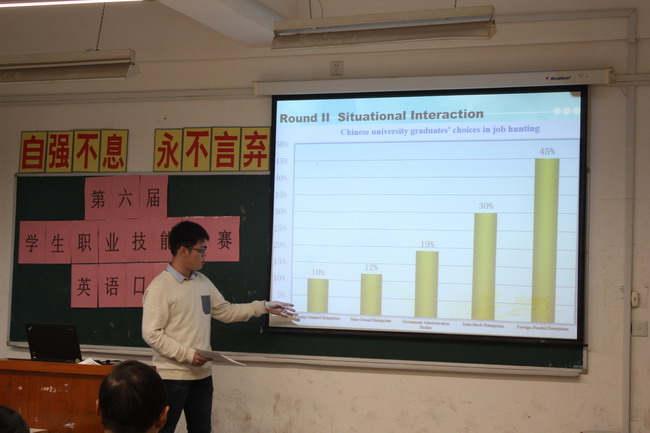 经过半个月的英语班级海选,全校共有87名来自各系、二级学院的学生参加了决赛。决赛分为两场,第一场包括个人简介和图表描述两个环节。第一场的优胜者进入第二场,即情境交流。比赛紧张刺激、悬念迭生、异彩纷呈。选手们以其扎实的语言功底、良好的心态、机敏的反应和精彩的现场发挥赢得了在场评委一致好评。经过4个小时的激烈角逐,经评委席的最后商议,共评出一等奖4名、二等奖9名、三等奖13名。来自2015级通信与工程系的学生林嘉琪一举夺魁,获得一等奖的第一名。