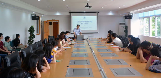 会上,教务处副处长陈林河解读了修订版的《学生学籍管理规定》,从修订背景、修订内容、修订特色及未来工作计划四个方面作了详细的解说;学工部部长邵菁解读了修订版的《学院学生违纪处分规定》,详细说明了新旧版的区别之处;院办副主任李旺解读了修订版的《学生校内申诉管理规定》。