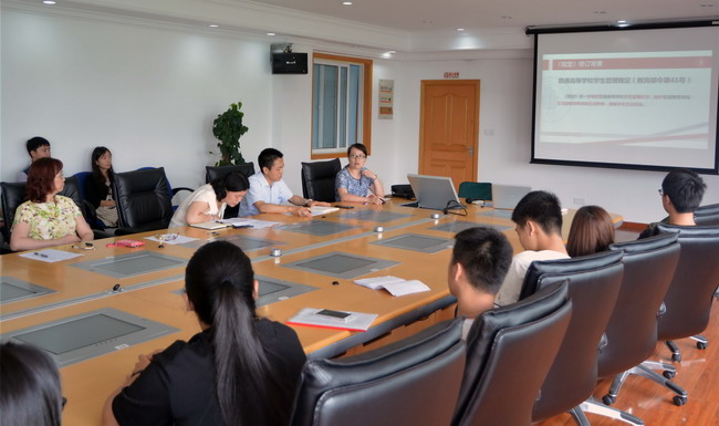 会上,窦争妍副校长介绍了教育部修订《普通高等学校学生管理规定》的目的是为贯彻中央新要求、适应经济社会发展新需要、体现高校教育与管理新变化,指出《规定》反映了高等教育工作的新理念新思想新战略、着力培养适应现代化建设需要的各类人才、体现以质量为核心、依法治校、民主管理等内容成为学校教育管理与服务的新内涵。