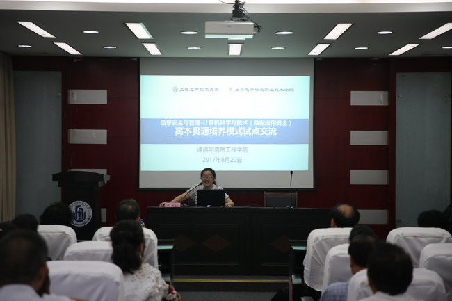 窦争妍副校长首先代表学校向远道而来的客人表示热烈欢迎,并介绍了学校的整体概况及教学改革情况,通信与信息工程学院副院长周巧婷介绍了信息安全与管理—计算机科学与技术专业高本贯通培养模式试点情况,王豪副校长对学校的热情接待表示感谢,表示学校在各方面都取得了很好的成绩,值得认真学习。