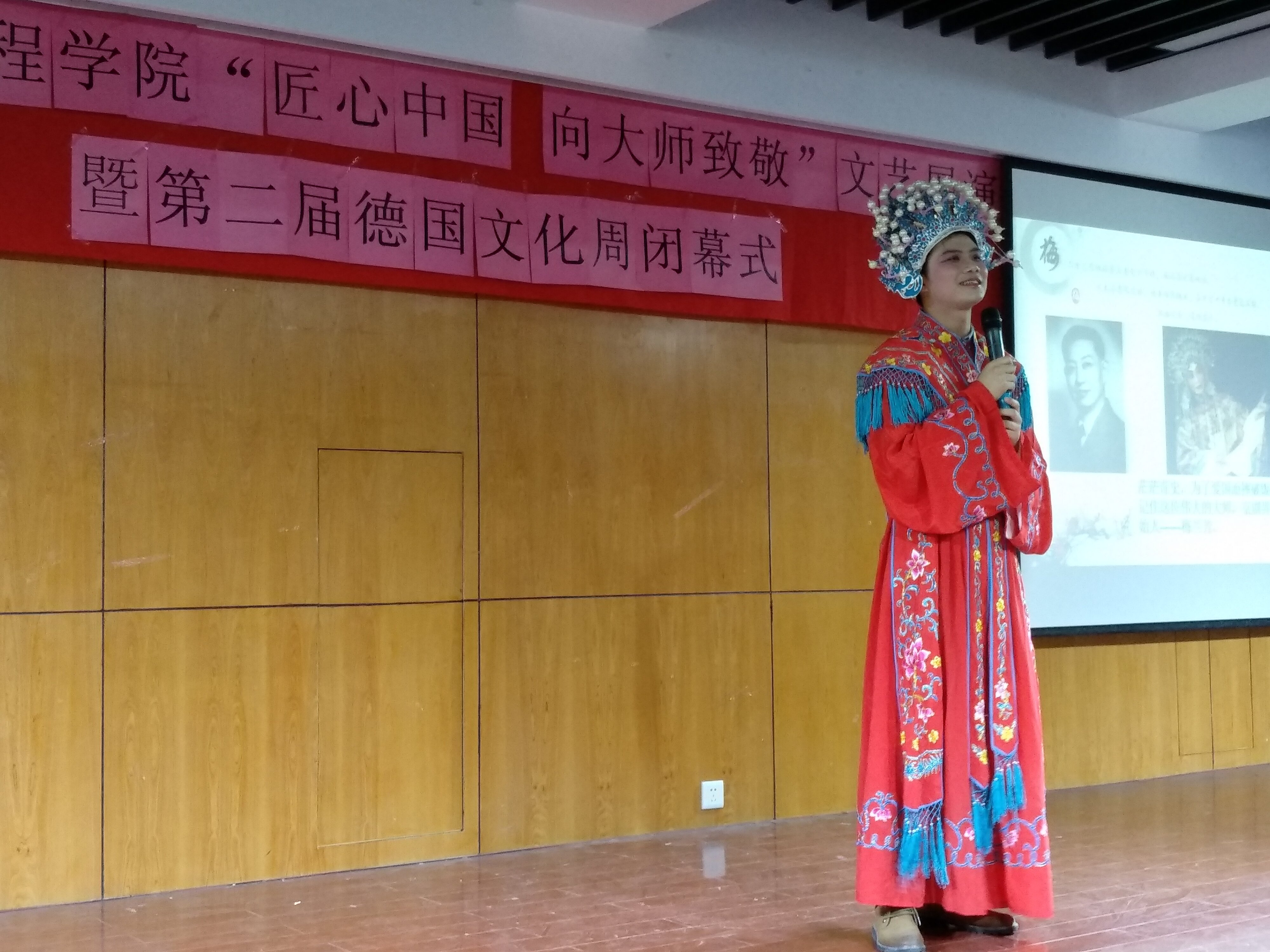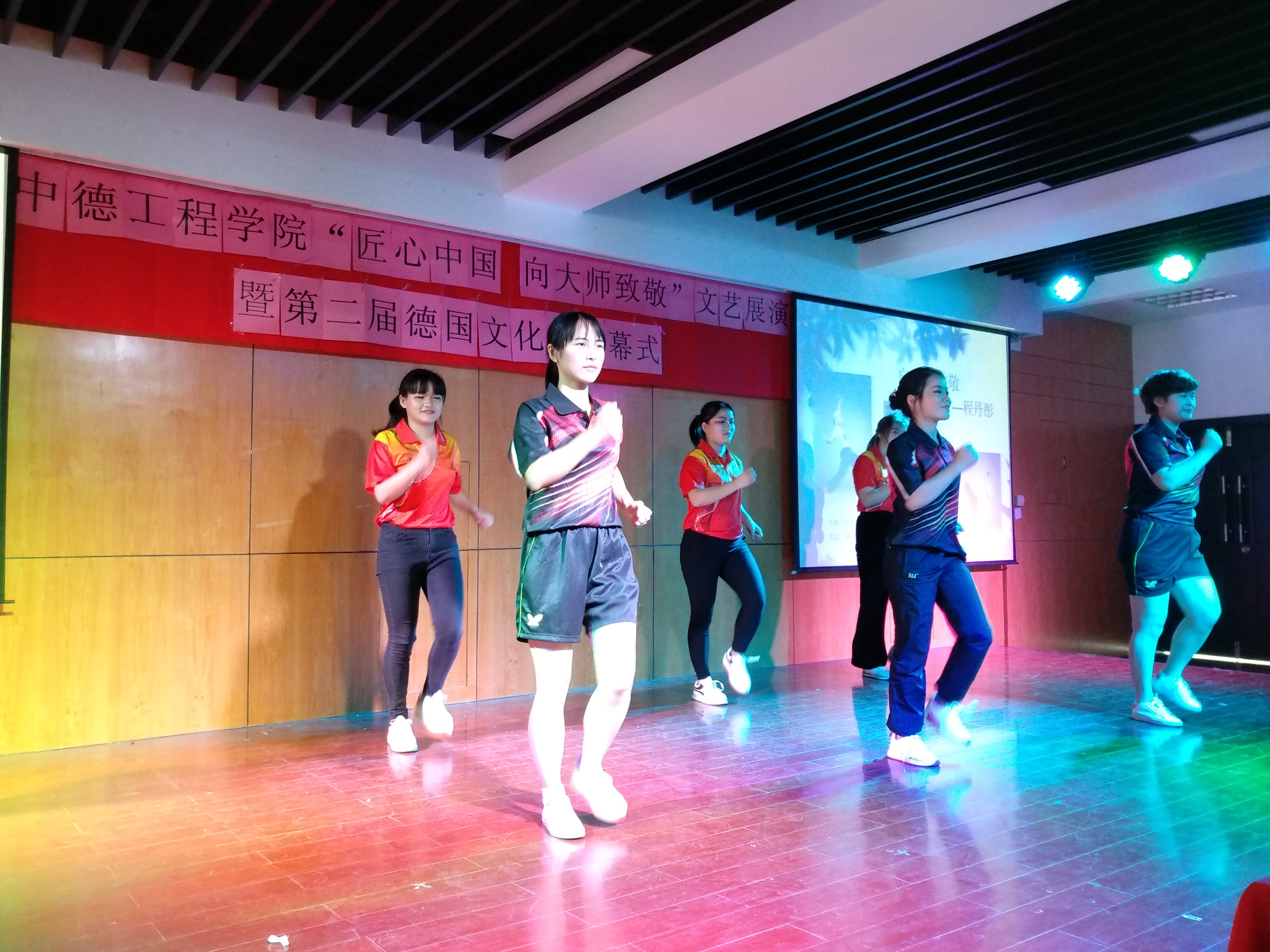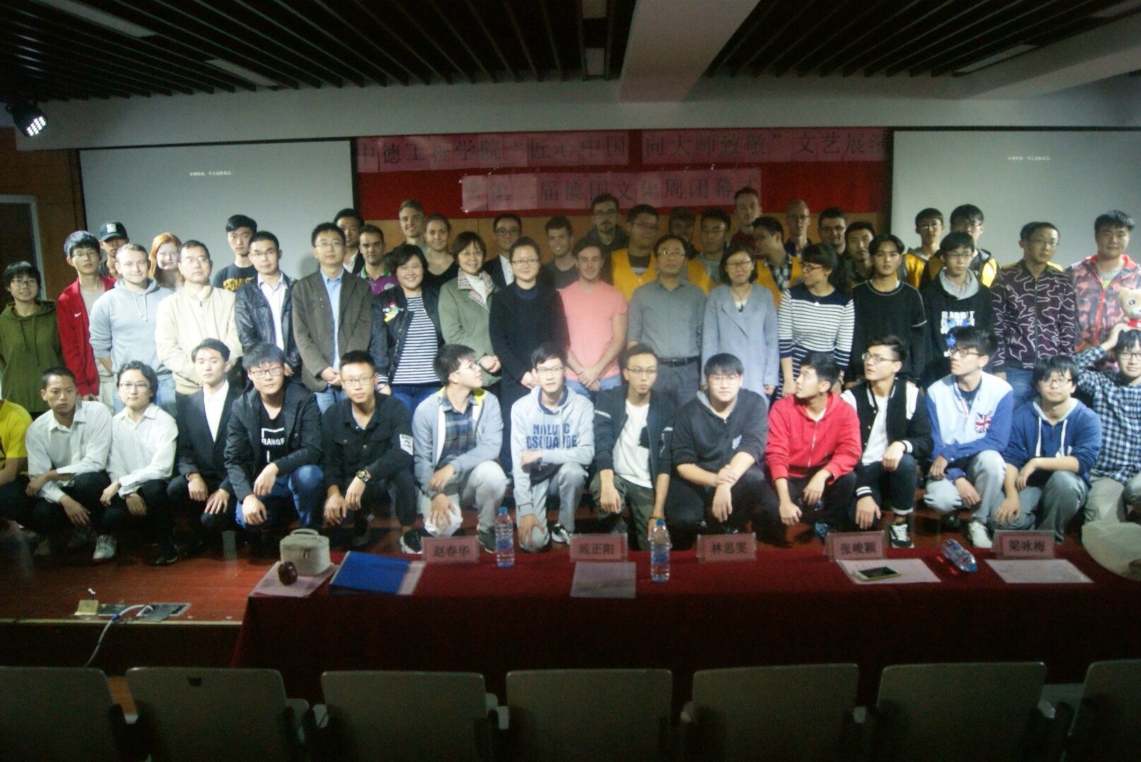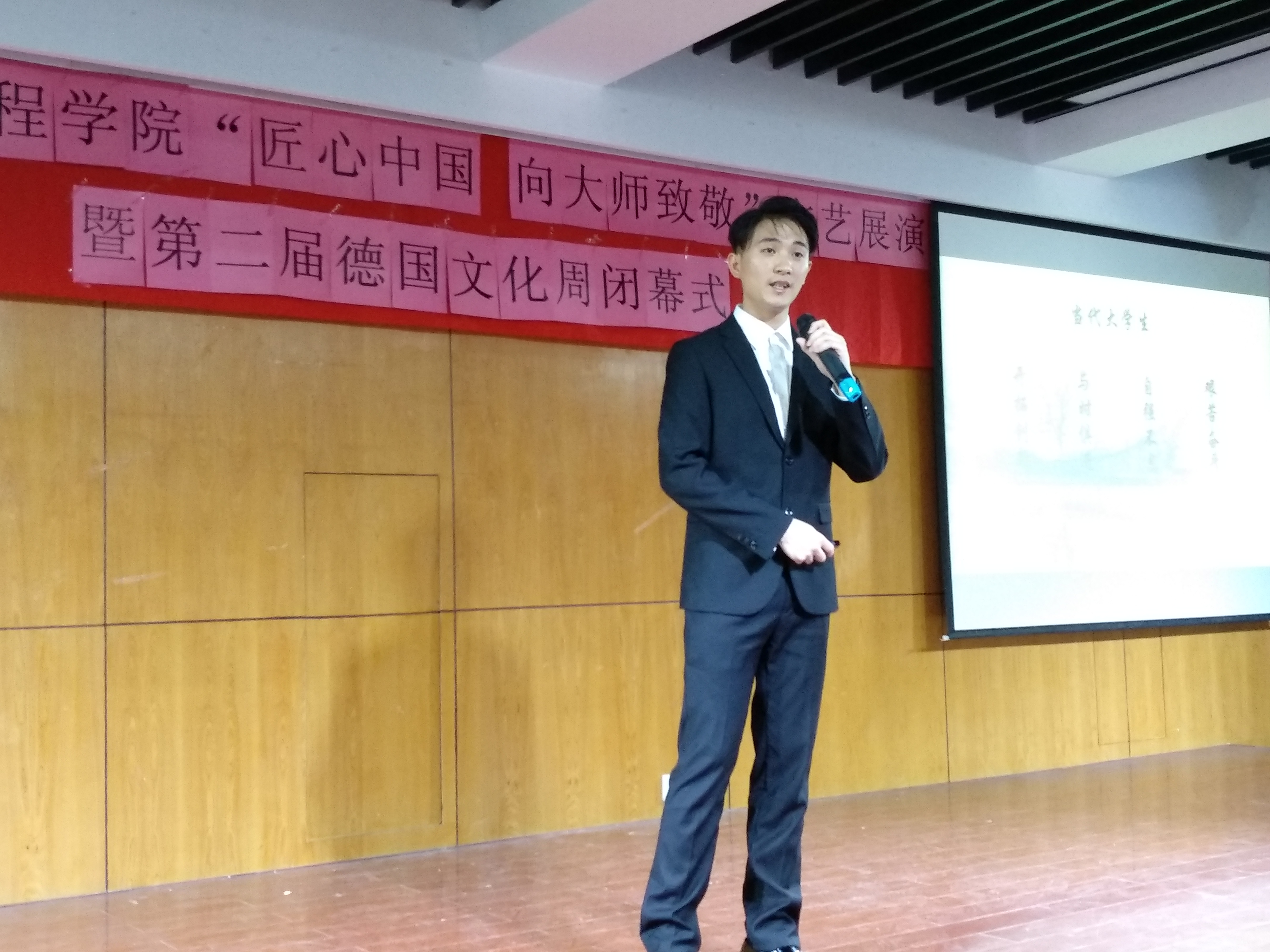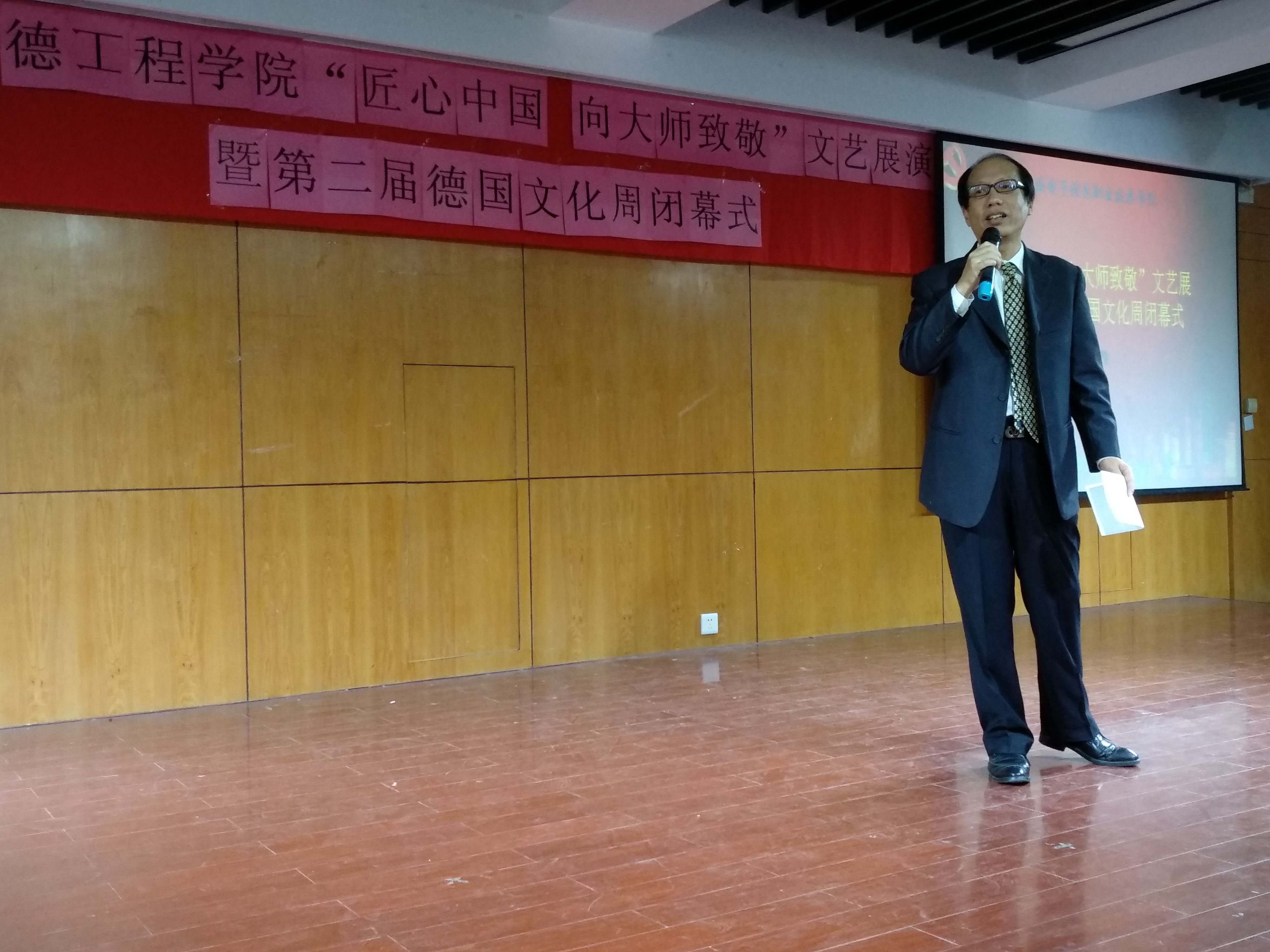 2017年11月3日中午12时30分,由上海电子信息职业技术学院中德工程学院党总支主办的 “匠心中国 向大师致敬”文艺展演活动暨德国文化周闭幕式在I401教室隆重举行。学校党委宣传部副部长林思雯老师,中德工程学院党总支副书记、副院长蔡林洁老师,中德工程学院副院长张峻颖老师,学校分工会委员、中德工程学院分工会主席戴正阳老师,中德工程学院教务主管赵春华老师,中德工程学院学生主管梁咏梅老师,德国兰茨胡特应用技术大学的交流生以及来自全院的250余人参加本次活动。