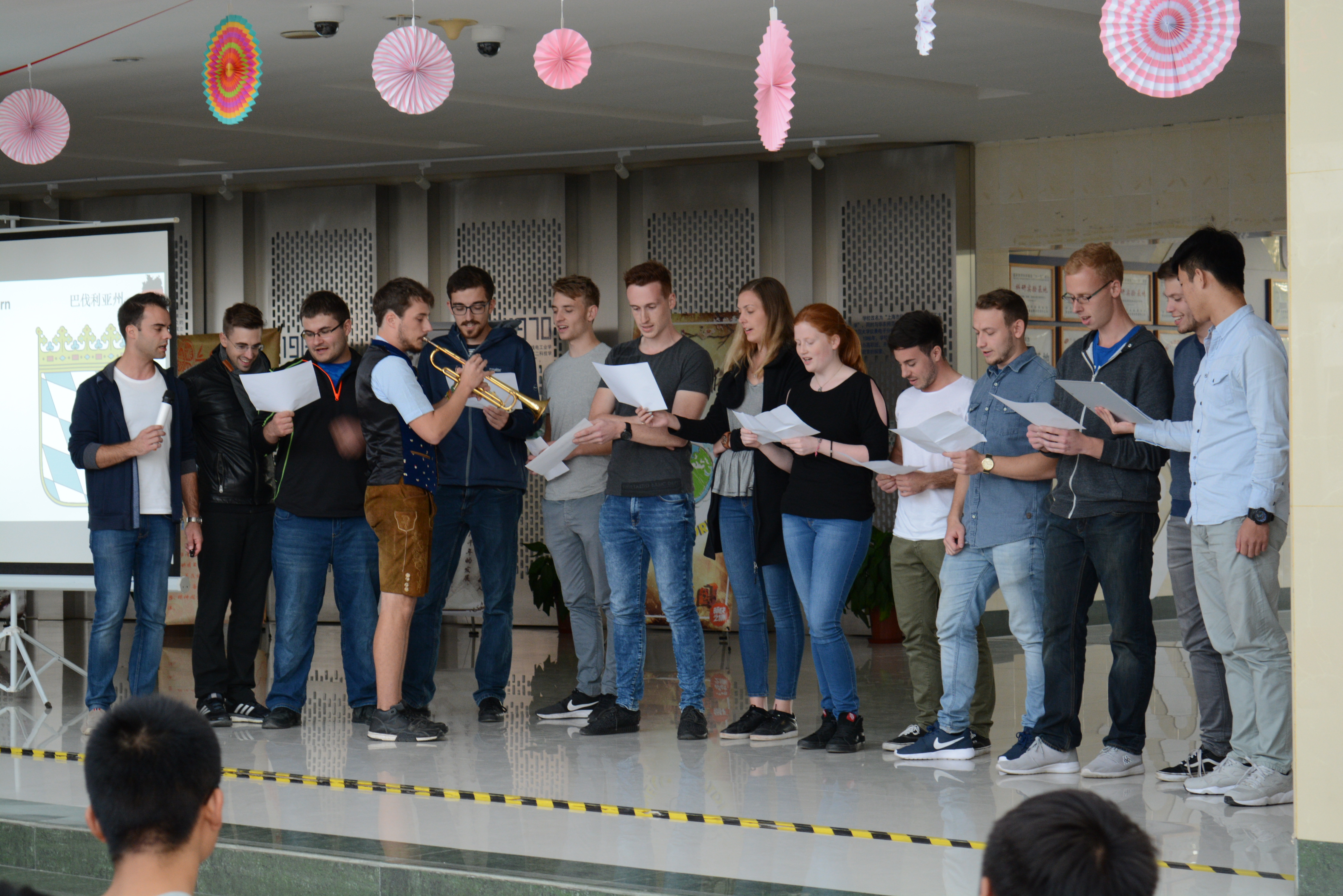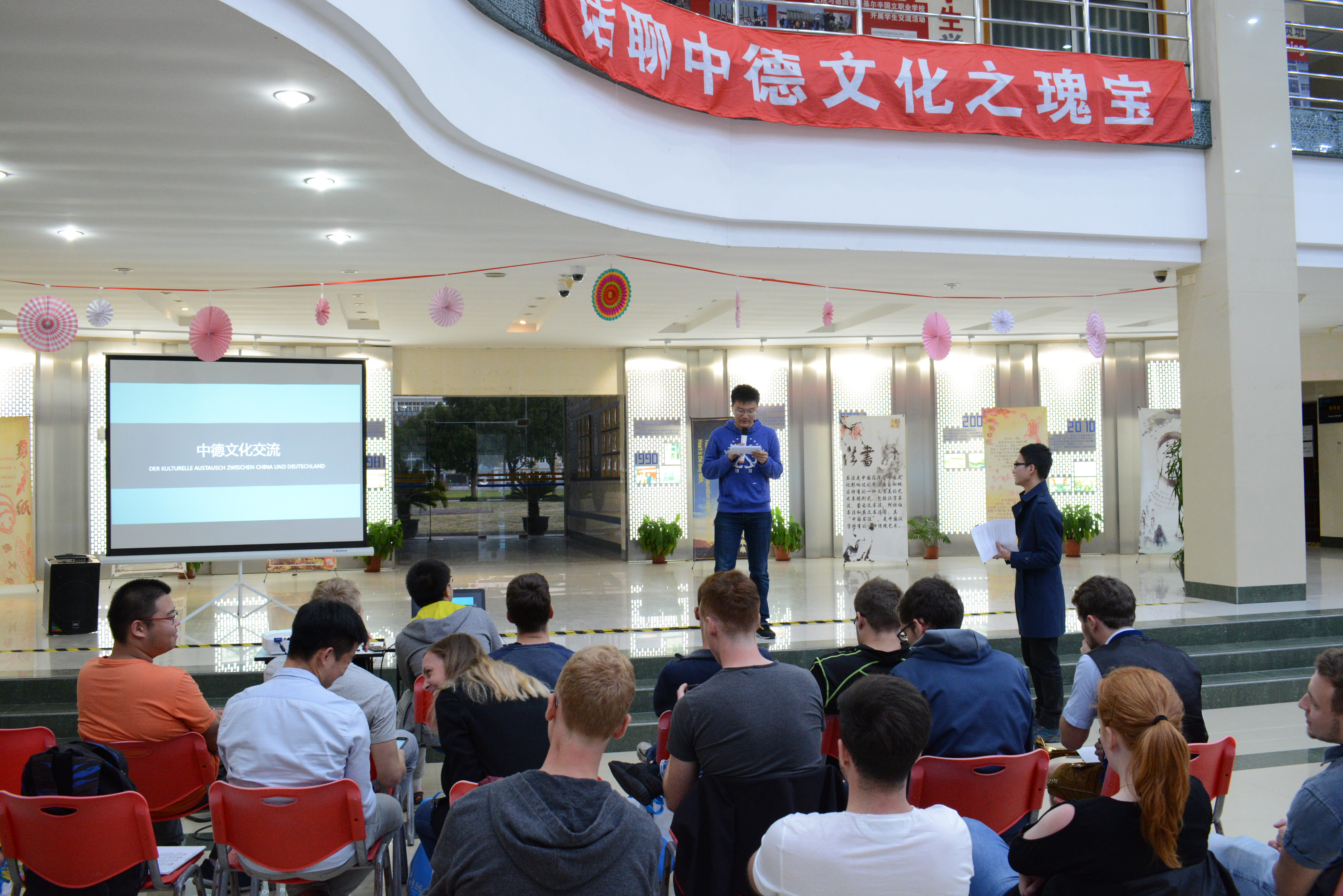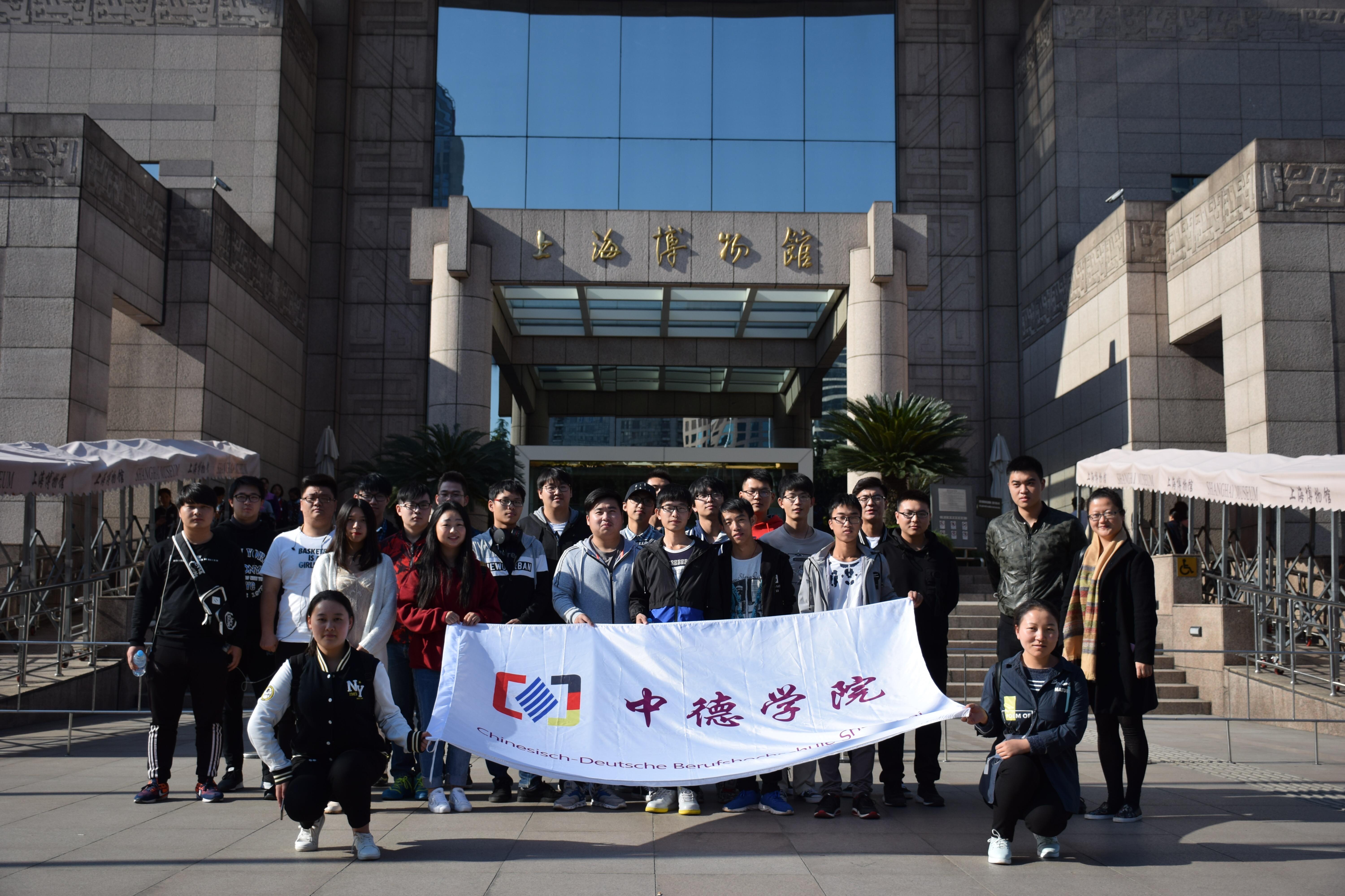 中德美术鉴赏活动于10月31日在建筑以圆顶方体的基座象征着“天圆地方”的上海博物馆如期开展,整个博物馆设有青铜、陶瓷、书法、绘画、雕塑、印章、玉器、钱币、少数民族工艺十个固定陈列厅,另有国际交流书画展等。它把我国的传统文化和时代精神巧妙地融为一体,所得到不同凡响的视觉效果,在世界博物馆之林独树一帜。馆中藏珍贵文物12万件,其中尤以青铜器、陶瓷器、书法、绘画为特色,藏品之丰富、质量之精湛,在国内外享有盛誉,参观不仅能让同学们了解我国古代的珍贵文物,也从喧嚣的城市生活中解脱,让心灵得到一次净化和洗礼;11月1日举办的话聊中德传统文化之瑰宝活动和中华文化传统礼仪微视频大赛相继在B楼大厅和易班网络平台展开,通过中德两国的历史、文化风俗、语言文字等交流呈现给大家不仅是中德两国文化荟萃,更是文化在一个国家所展现的力量,德国交流生的流连忘返和易班网络平台的高额投票率见证了我们中德文化的互动交流;为了贯彻和秉承党的十九大精神,践行社会主义核心价值观,11月2日在I401举办了 “匠心中国”系列课程之党课教育讲座,特邀请了上海师范大学陈蓓丽副教授为师生带来题为《秉承十九大守住“匠心”彰显职业精神——从社会工作看职业精神养成》的讲座,陈教授从社会工作者和专业教师的视角,来阐述如何从本职岗位和工作内容出发来培养自己的职业精神。讲座结合实际社会工作案例,深刻剖析如何培养和恪守自己的职业精神,如何守住爱心,如何守住匠心,师生反响热烈,讲座深受师生好评;此外,德国电影鉴赏也分三个晚上分别进行,通过《鸟瞰德国》无比伦比的德国风光蓝光高清纪录片鉴赏和交流,画质唯美的德国所有经典的景色不仅带给同学们视觉感受上的震撼,也让同学们更全面的了解到了德国的历史和文化。