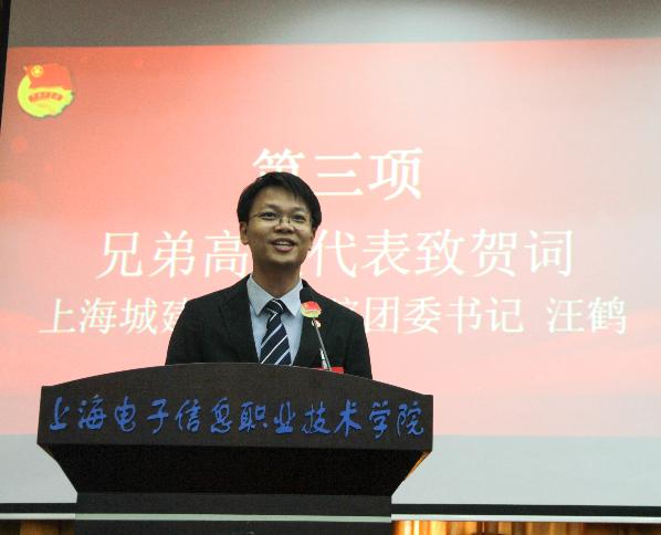 会议第一项议程,全体起立,奏唱《中华人民共和国国歌》,大会在雄壮的国歌声中,隆重的拉开了序幕。紧接着由与我校共青团区域共建的洪庙小学少先队员带来了来自他们对于本次团代会的献词,为大会送上了美好的祝愿。上海城建职业学院团委书记汪鹤代表兄弟高校致贺词,他说,“在新时代我们要格物致新,紧随时代,牢固新时代思想根基,明确方向,加深内涵,砥砺青年,服务青年,注重组织帮助与关怀,衷心祝愿上海电子信息职业技术学院共青团蓬勃发展,也预祝本次大会取得圆满成功。”