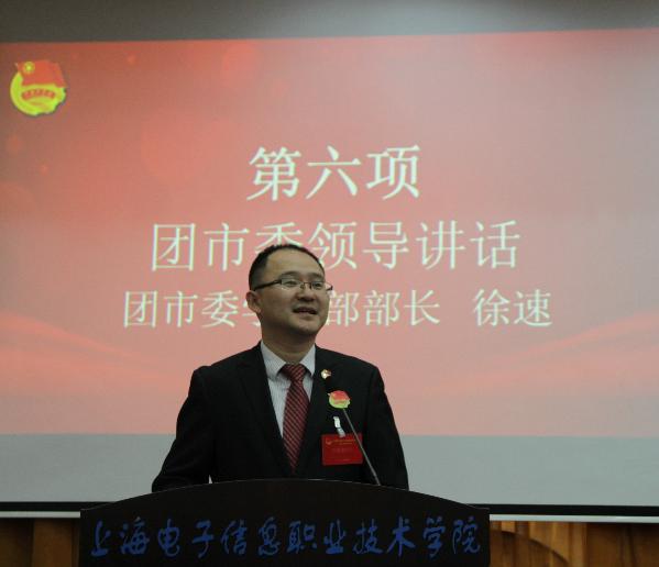 随后,共青团上海市委员会学校部部长徐速发表重要讲话,他首先向全校的团员青年表示诚挚的问候,向长期以来关心支持共青团工作的各位领导、师生朋友表示衷心的感谢。在讲话中,对上海电子信息职业技术学院全体团干部和团员青年提出了三点要求,一要把政治性放在首位,牢牢抓住思想引领这个核心工作不放松;二要把加强自身建设作为团的工作的根本保障,充分体现先进性;三要发挥团组织的群众性特点,把服务学校中心工作、服务青年实际需求作为工作的出发点和落脚点。最后,希望我校共青团组织在学校党委和上级团组织的正确领导下,带领全校团员青年和全市青年一道,在新时代坐标中坚定追求卓越的发展取向,把个人发展与城市发展紧密结合起来,在建设卓越的全球城市的伟大实践中贡献青春力量,书写青春华章!