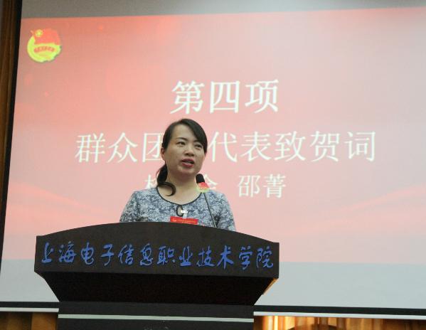 随后,学校工会常务副主席邵菁代表群众团体致贺词,她代表学校工会向大会召开表示热烈的祝贺,向出席大会的全体代表致以诚挚的问候。她讲到,团代会的召开对于学校和广大青年来说意义重大,大会的召开将推进学校育人工作迈向新台阶,将激励广大青年励志发奋、成长成才。相信通过此次大会,上海电子信息职业技术学院共青团一定能够进一步贯彻党的十九大精神,肩负起党寄予青年的责任,秉记学校的期望,为党的事业以及学校的发展而努力。同时,全体团员要不忘初心,砥砺前行,遵纪守法,脚踏实地,练就过硬本领,勇做新时代的弄潮儿。