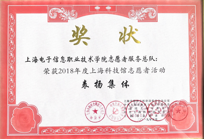 5月29日,“志愿建功新时代 砥砺奋进新征程”2019年上海科技馆志愿者表彰会在上海科技馆报告厅举行,我校通信与信息工程学院2016级孙正杰同学、2017级王子涵同学、机械与能源工程学院2015级张荣泰同学荣获2018年度上海科技馆志愿者活动“积极分子”光荣称号;何川老师荣获2018年度上海科技馆志愿者活动“优秀组织者”光荣称号;我校志愿者服务总队荣获2018年度上海科技馆志愿者活动“表扬集体”光荣称号。