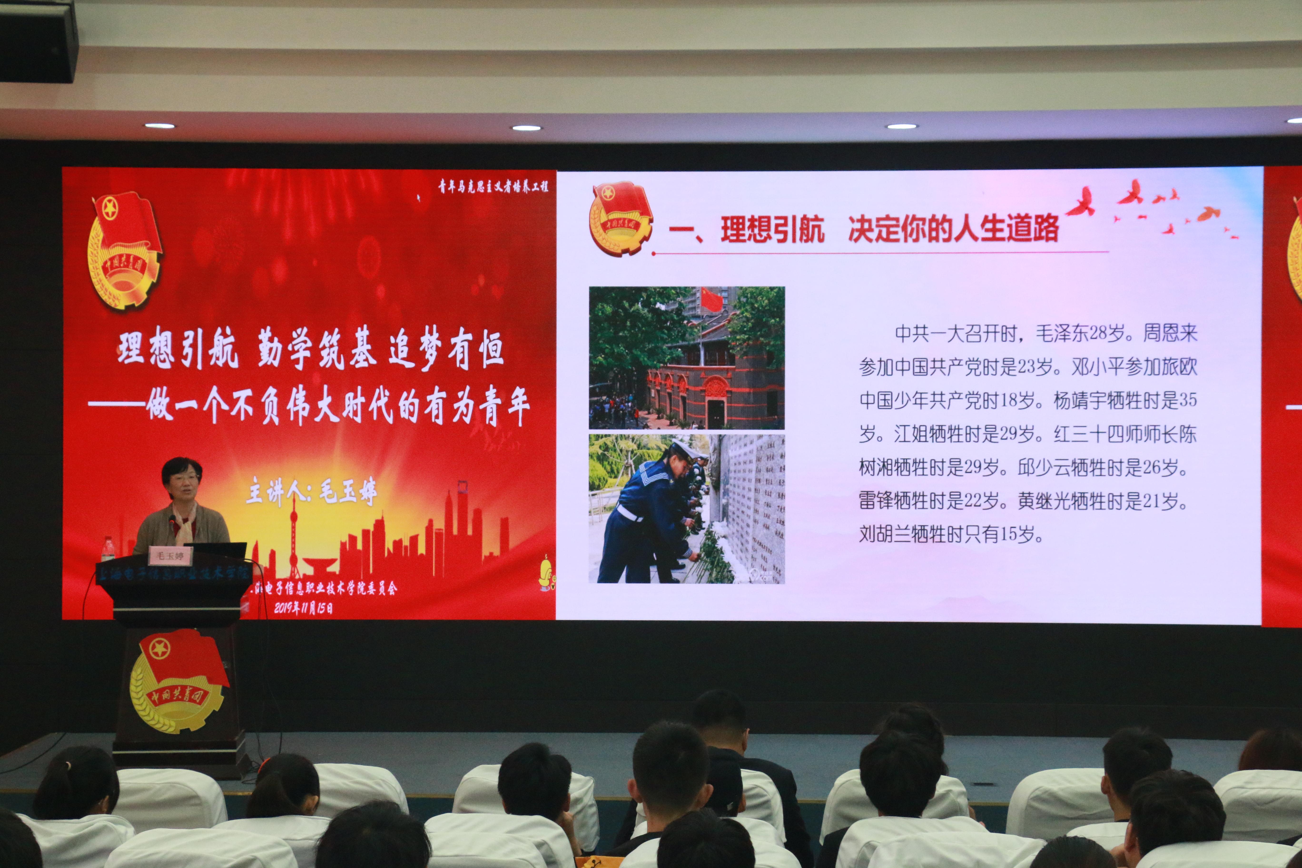 为进一步推进中国特色社会主义理论和习近平总书记系列讲话精神进团课,紧紧依靠党建带团建,牢牢把握育人的主线,使青年团员成长为中国特色社会主义事业合格的建设者和可靠的接班人。11月15日中午,校党委副书记、纪委书记毛玉婷应邀在中德楼C108报告厅为2019年青年马克思主义者培养工程的大骨班及活力班学员作《理想引航 勤学筑基 追梦有恒——做一个不负伟大时代的有为青年》主题团课。
