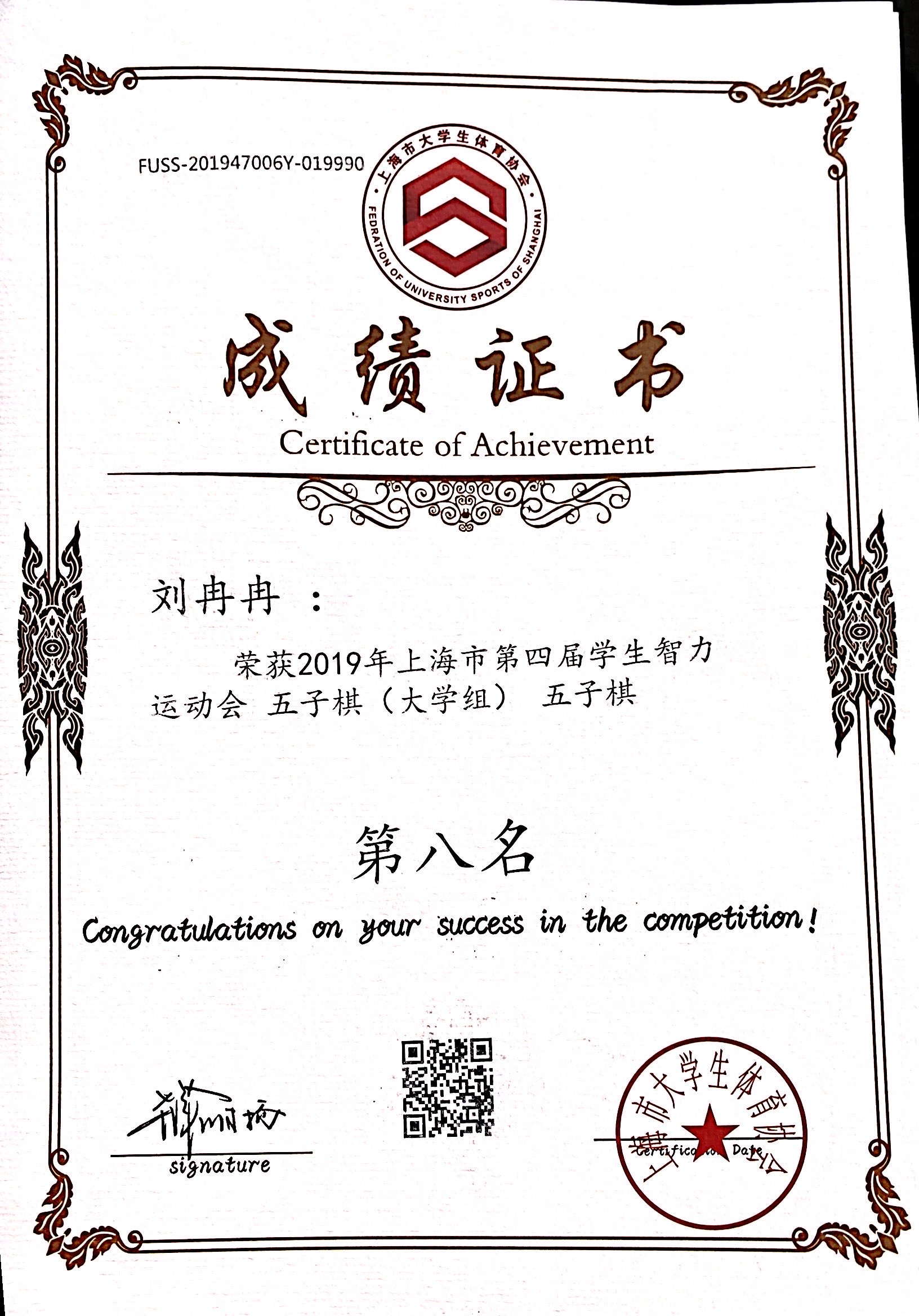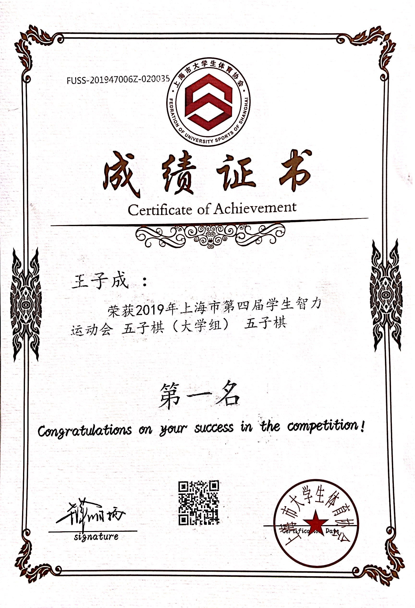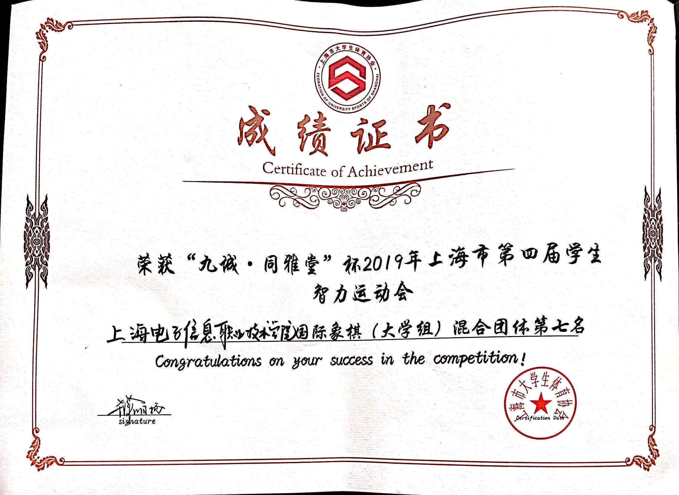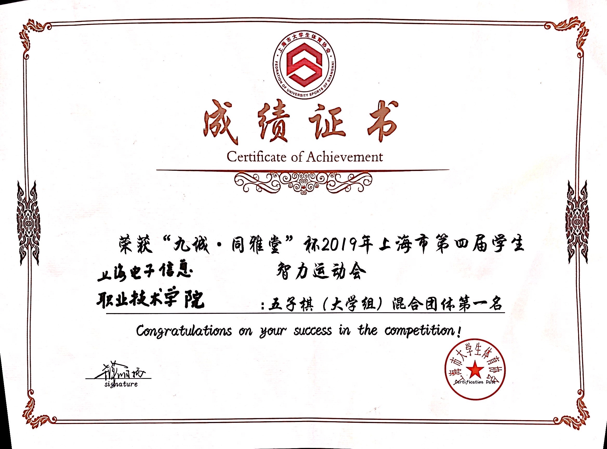 11月30日至12月1日,“九城·同雅堂”杯2019年上海市第四届学生智力运动会在上海财经大学举办,我校棋艺社五子棋代表队荣获团体第一名的好成绩,其中五子棋男子组机械与能源工程学院严煜杰同学荣获个人第三名,机械与能源工程学院王子成同学荣获个人第四名,女子组设计与艺术学院刘冉冉同学荣获个人第八名,国际象棋组经济与管理学院陆汇、通信与信息工程学院张文轩、郁铭慧同学荣获团体第七名。
