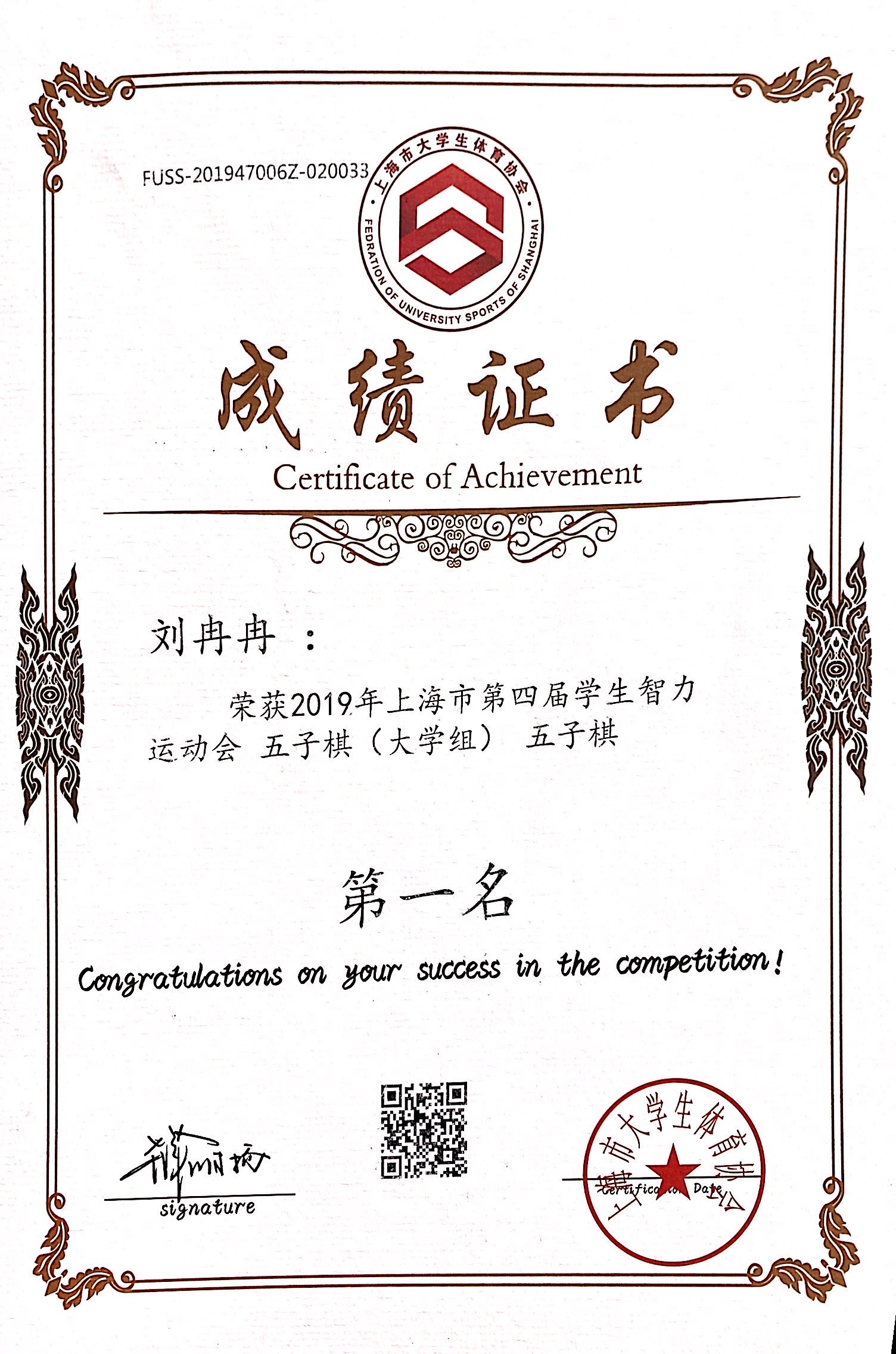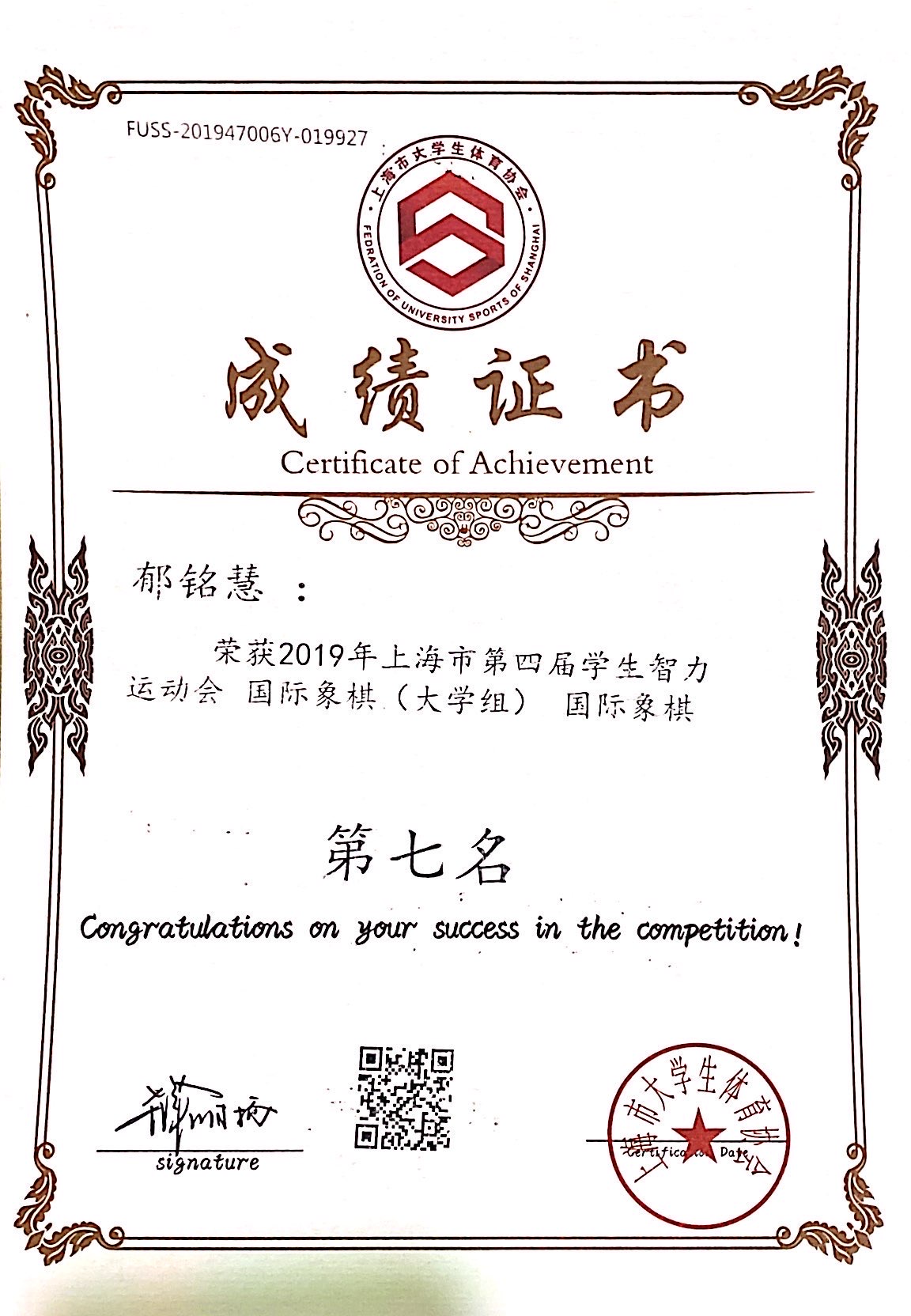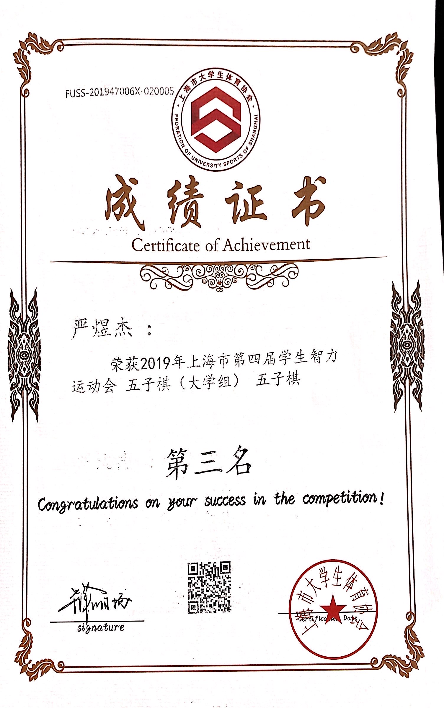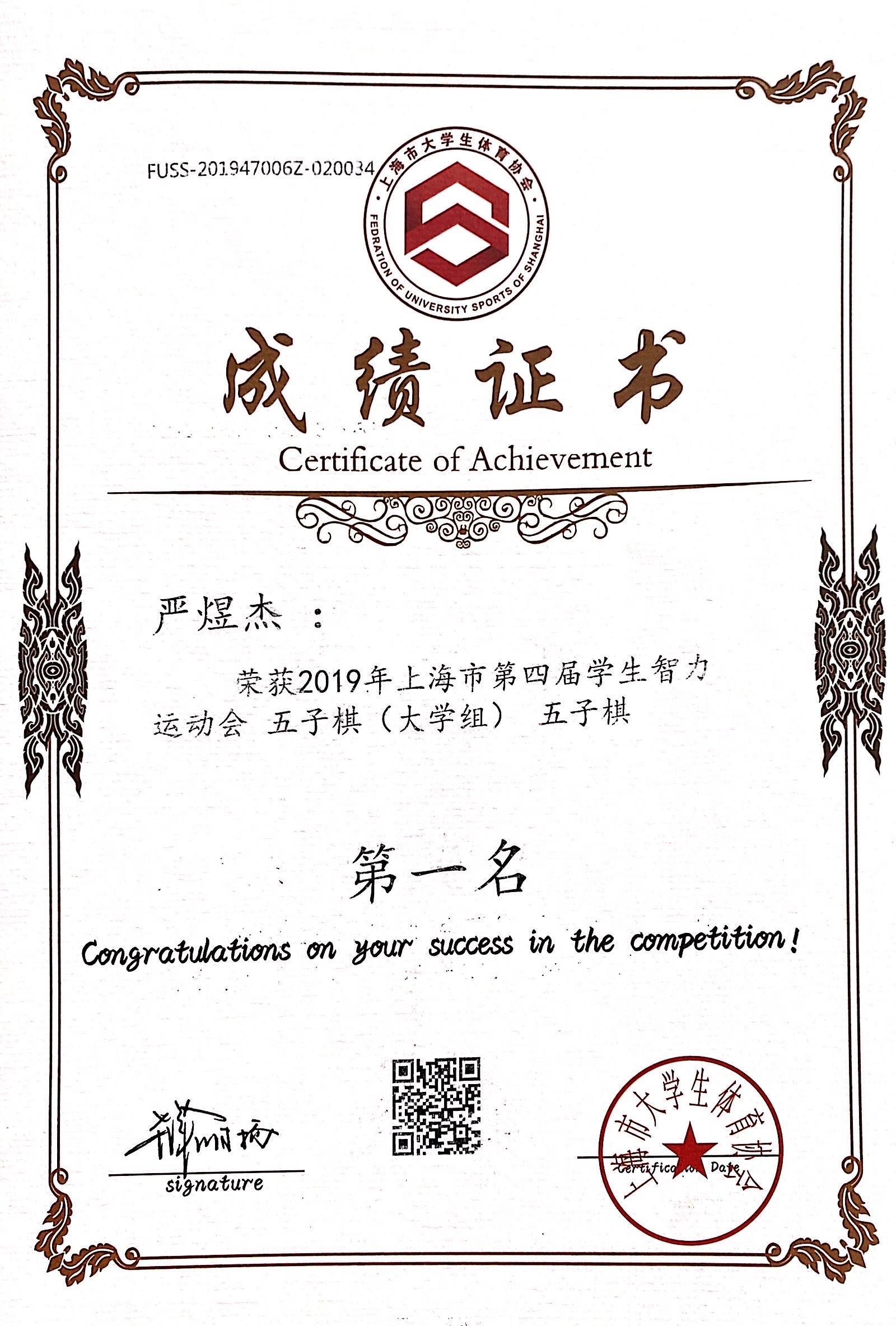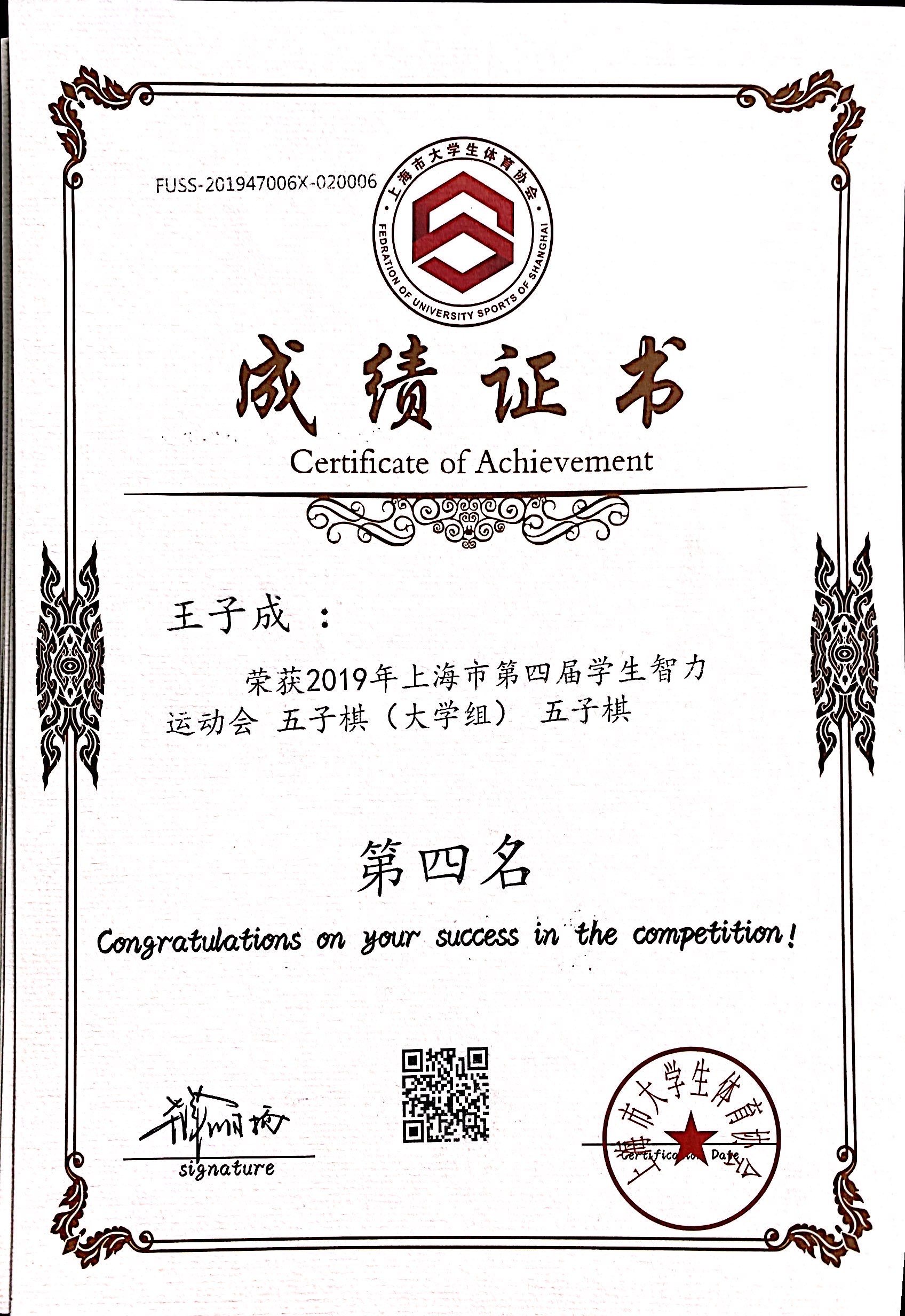 11月30日至12月1日,“九城·同雅堂”杯2019年上海市第四届学生智力运动会在上海财经大学举办,我校棋艺社五子棋代表队荣获团体第一名的好成绩,其中五子棋男子组机械与能源工程学院严煜杰同学荣获个人第三名,机械与能源工程学院王子成同学荣获个人第四名,女子组设计与艺术学院刘冉冉同学荣获个人第八名,国际象棋组经济与管理学院陆汇、通信与信息工程学院张文轩、郁铭慧同学荣获团体第七名。