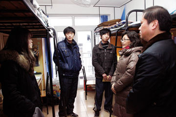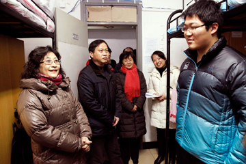 2013年1月8日傍晚,学院领导杨秀英、顾剑锋、徐松鹤、严晓华、吴依本、周俊瑜,院长助理林春方、胡国胜,党办、院办、学工部等相关职能部门负责人和各系部(二级学院)党支部书记分别走访学生宿舍,关心慰问家庭经济困难学生,把爱心大礼包、冬被、爱心屋衣物专用券等生活学习用品送到他们手中,给他们带去心灵的温暖。