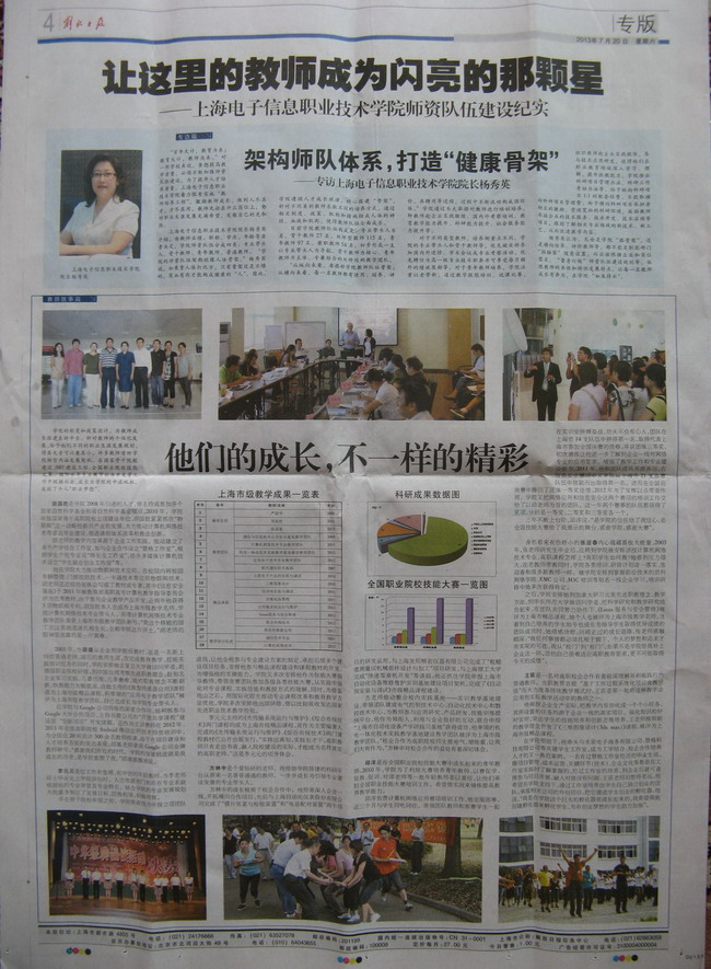 2013年7月20日出版的《解放日报》在四版以“让这里的教师成为闪亮的那颗星”为题刊登文章,介绍上海电子信息职业技术学院师资队伍建设纪实。/p>