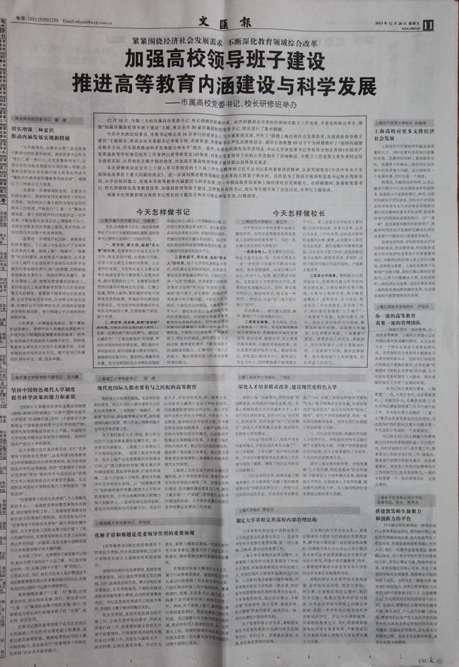 2013年12月20日出版的《文汇报》在第十一版以“加强高校领导班子建设 推进高等教育内涵建设”为标题,刊登了我院党委书记、院长杨秀英在市属高校党委书记、校长研修班上的主题发言“搭建激发师生凝聚力和创新力的平台”。(《文汇报》文章链接地址:http://whb.news365.com.cn/ewenhui/whb/html/2013-12/20/content_82.htm/a>)/p> 全文如下: