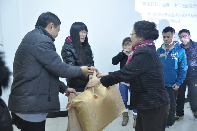 杨院长和系领导为学生代表发放了棉被、毛毯以及文具用品等送温暖物资,并叮嘱同学们有困难及时向老师反映,学校会尽力帮助大家。