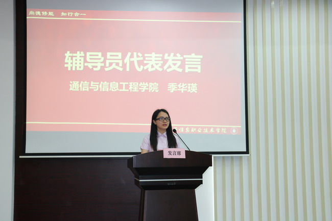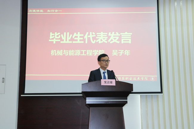 学校党委书记、校长杨秀英教授为毕业生们送上寄语。她说,同学们生活在国家日益繁荣昌盛的伟大时代,祖国和人民对你们抱有更高的期望,社会历史发展离不开职业教育人才。职业教育先驱黄炎培先生认为,任何教育都不应只是一种单纯谋生求职的工具或手段,而应把它视为一种自我实现及自身发展的愉悦体验。学校重视科学精神和人文精神的渗透与培育,着力于培养学生的健全人格和全面发展。杨校长深情地说,毕业之际,有两样“东西”送给同学们——厚德之心与博学之志。一个人的价值不在于得到多少,而是奉献了多少。同学们要能胸怀天下,敢于担当,要有大爱和大德。“学不博则不能守约,志不笃则不能力行”,同学们要将“尚德修能·知行合一”的校训铭记于心,博学笃志,身体力行,以更广博的知识、更坚定的志向迎接未来更艰巨的挑战。最后,杨校长对毕业生提出三点希望:一是要具有远大抱负,坚持理想,坚守信念,心怀世界和产业发展,肩负起中华民族复兴的伟大使命;二是能够做到脚踏实地,远大的抱负是靠一点一滴的行为来实现的,脚踏实地就是实现梦想最好的捷径;三是拥有创新思维,科技突飞猛进,生活日新月异,希望同学们对生活充满乐趣,对未来满怀信心,用创新精神和创新能力去创造美好的生活和未来。