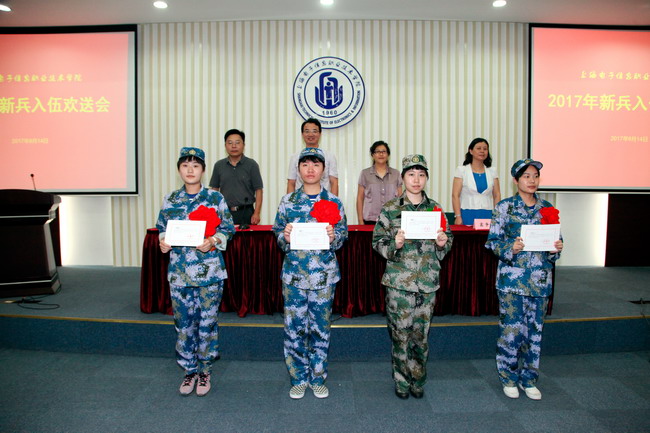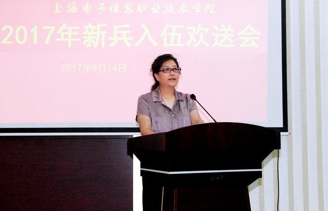 2017年9月14日,学校入伍新兵欢送会在C108报告厅隆重举行。学校党委书记、校长杨秀英、党委副书记、副校长顾剑锋、副校长窦争妍、副校长吴依本、相关部门领导、入伍同学及部分家长等参加了欢送会。会议由副校长吴依本主持。