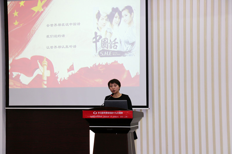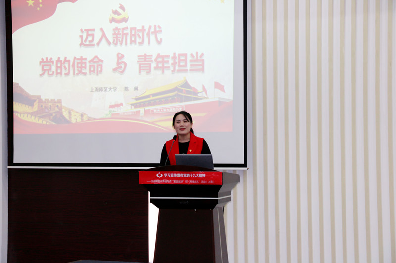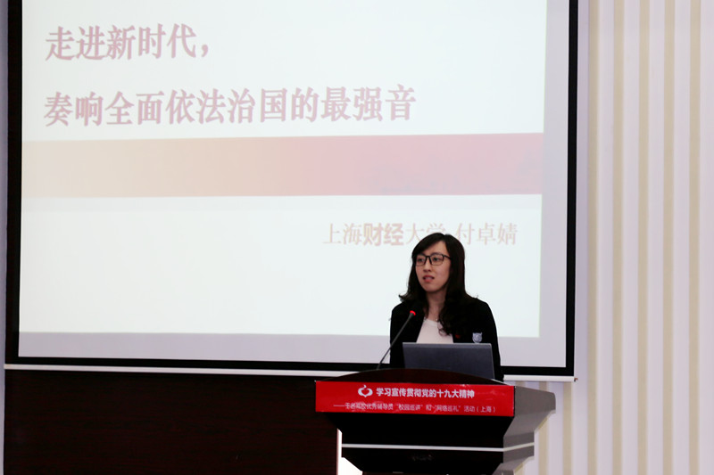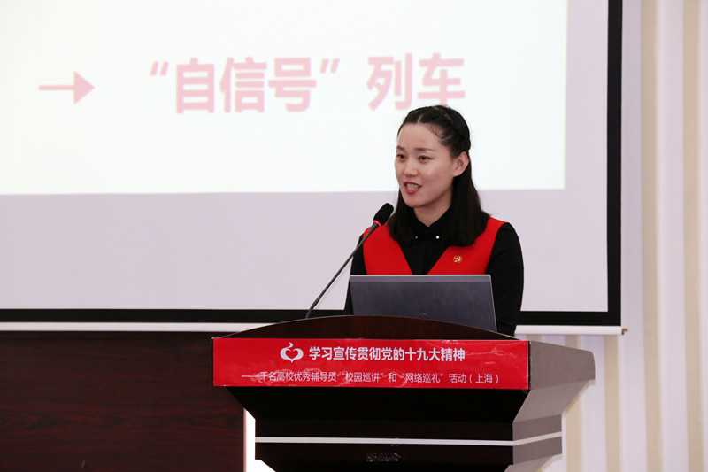 上海交通大学团委副书记武超、东华大学辅导员魏金婷、上海立信会计金融学院辅导员王珲、上海财经大学法学院学工办主任付卓婧及上海师范大学辅导员陈琳五位老师依次巡讲,他们分别以《逐梦新时代,当代青年的选择》、《自信新时代,增强四个自信,坐自信号列车》、《书写新时代,坚定青年人的文化自信》、《走进新时代,奏响全国依法治国的最强音》、《迈入新时代,党的使命与青年担当》为题,从责任、使命、自信、文化等方面生动活泼地对十九大精神内涵进行了解读。