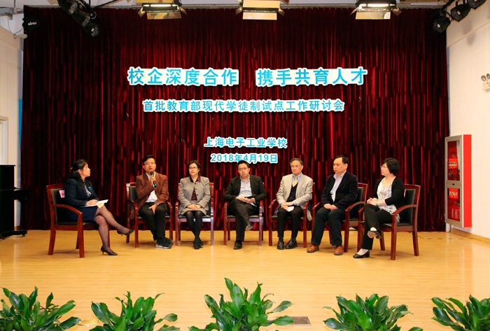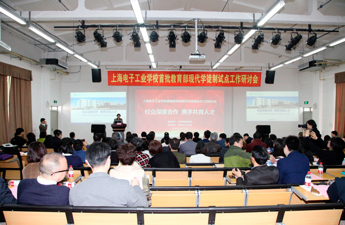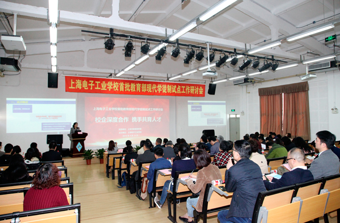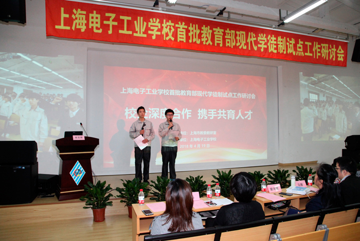 为深入贯彻党的十九大关于深化产教融合、校企合作的相关精神,落实教育部《关于开展现代学徒制试点工作的意见》,进一步探讨和交流现代学徒试点过程中的校企合作育人机制,完善技术技能人才培养模式,顺利做好试点工作的全面总结和特色提炼,4月19日,上海市首批教育部现代学徒制试点工作研讨会在我校闵行校区(上海电子工业学校)召开。上海市教委教研室党总支书记于兰英、市教委职教处马骏、市教委教研室教研员曾海霞、同济大学职教研究所副所长徐朔、上海市教科院职成教研究所副所长陈嵩、上海师范大学教育系副主任关晶、上海松下微波炉有限公司副总经理蒋凯、上海摩意科技有限公司总经理叶唯中、上海市现代学徒制试点单位项目分管领导和专业主任、部分合作企业代表、外省市学校代表,我校党委副书记、校长杨秀英等近百名领导和专家出席了会议。