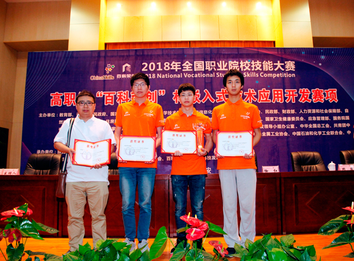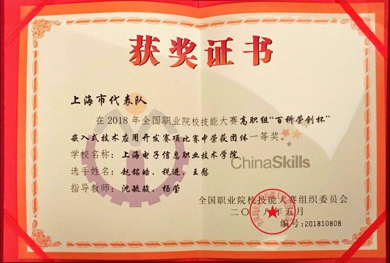 “嵌入式技术应用开发”赛项紧随嵌入式技术领域的最新发展趋势,是集单片机技术、传感器技术、嵌入式技术、无线通信技术、语音识别、图像处理、Android智能设备与控制技术于一体的综合性赛项,赛项重点考察软、硬件结合,全面检验学生嵌入式技术应用开发的工程实践能力和创新能力。在持续长达十余小时的紧张比赛中,我校参赛队完成了电路板的焊接、调试、排障、安装、嵌入式微处理器控制程序编写与调试,开源硬件程序编写与调试、Android应用开发以及系统集成应用,获得评委的高度评价和认可,最终荣获全国一等奖,杨莹、沈毓骏老师荣获优秀指导教师奖。