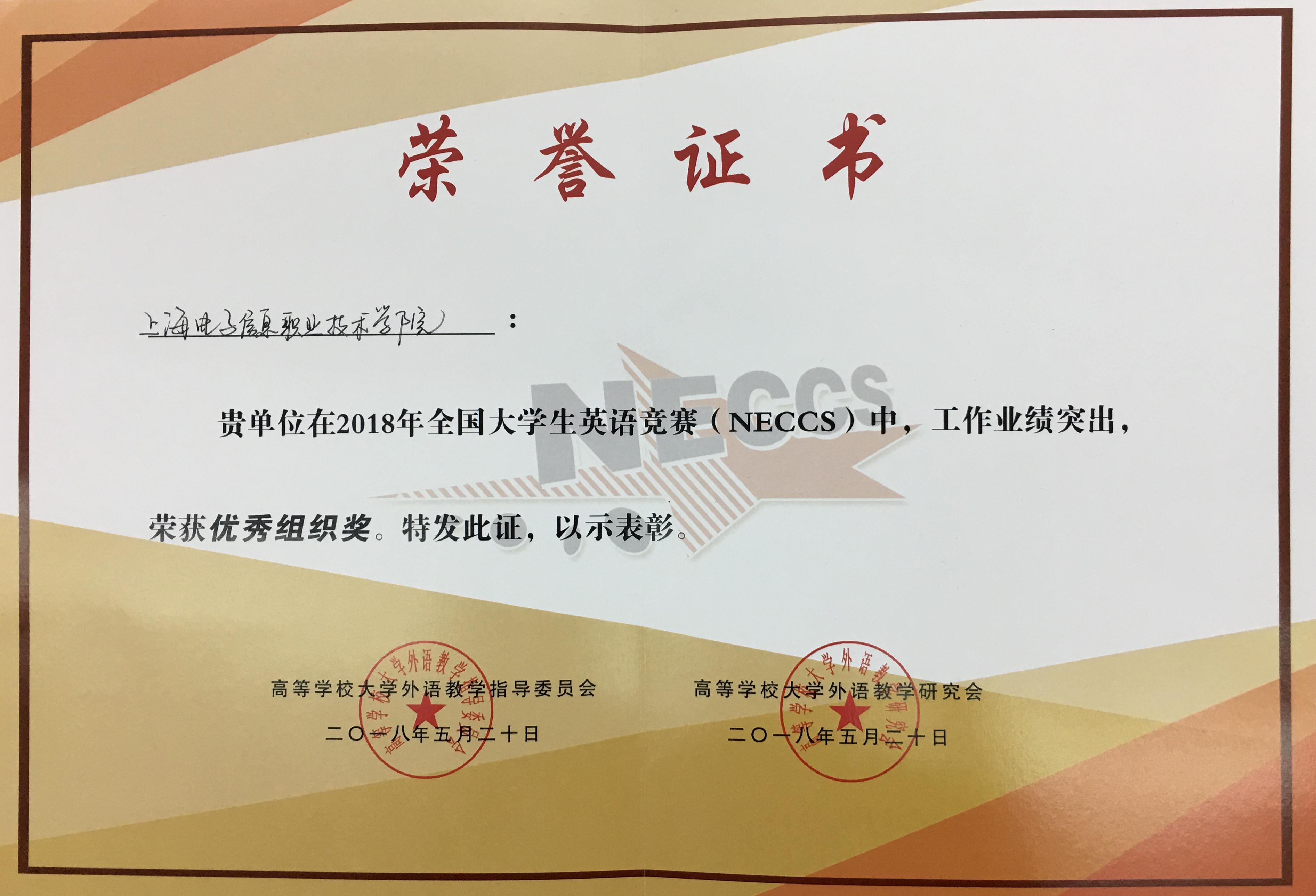 5月20日,由教育部高等学校大学外语教学指导委员会和高等学校大学外语教学研究会联合主办全国大学生英语竞赛(NECCS)决赛在上海交通大学举行,2018年共有来自全国31个省份1300余所高校的近120万在校大学生参赛。由外语学院肖潇老师指导的2016级电子技术与工程学院的黄庆峰同学经层层选拔、激烈对决,最终荣获全国高职组(D类)一等奖,2017级外语学院严瑾等5位同学荣获二等奖,10名同学荣获三等奖;上海电子信息职业技术学院作为参赛单位,由于赛绩突出,亦荣获“优秀组织奖”的殊荣。