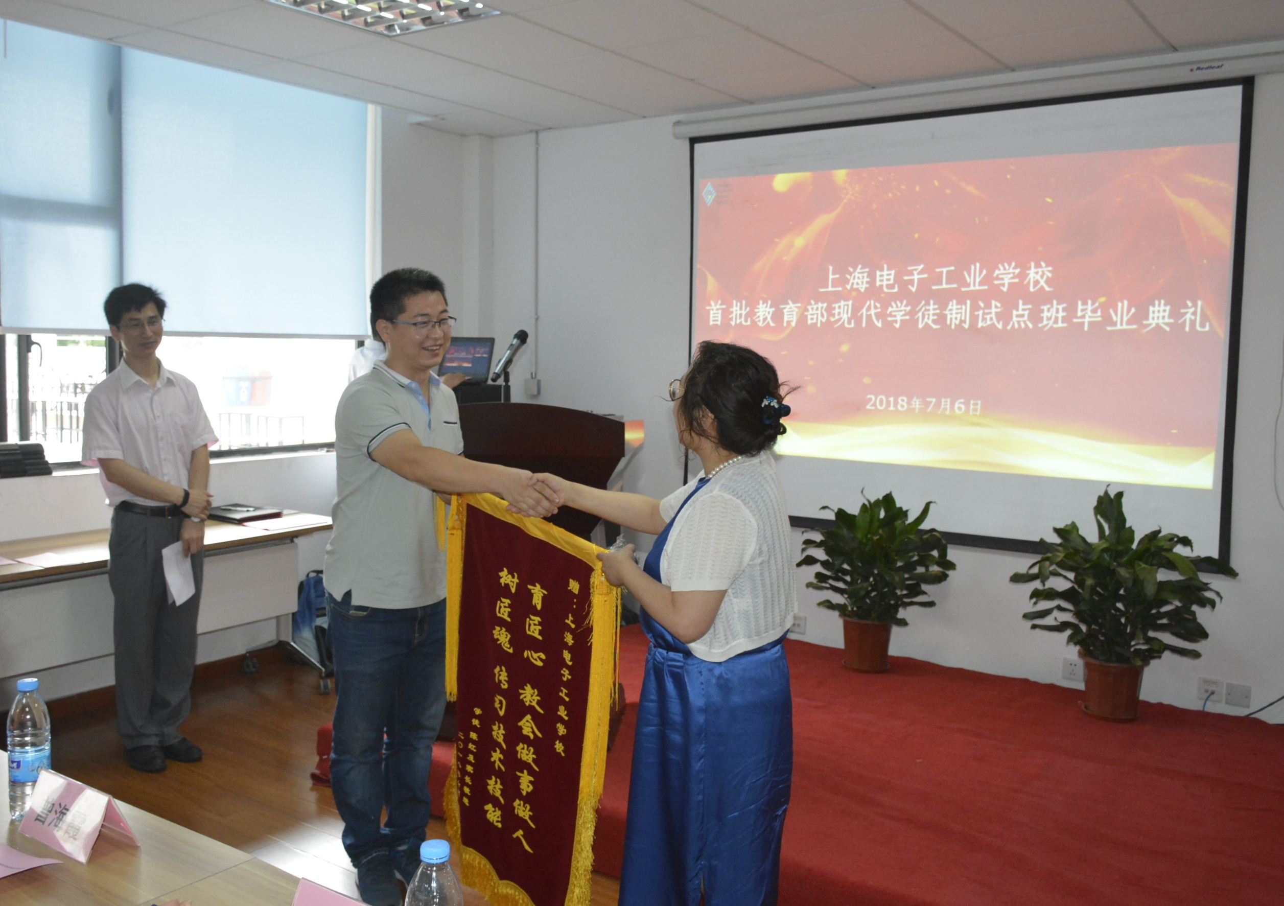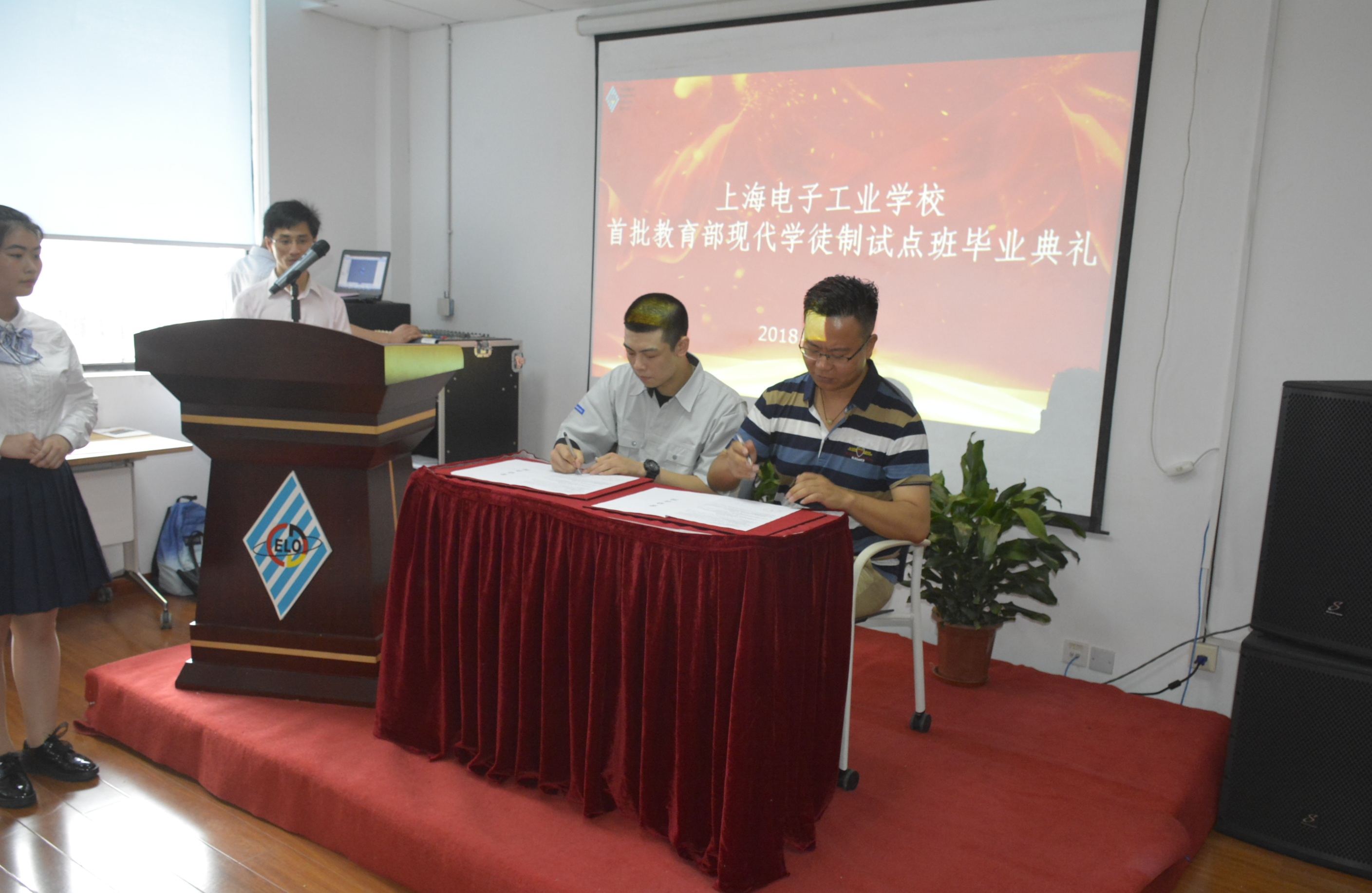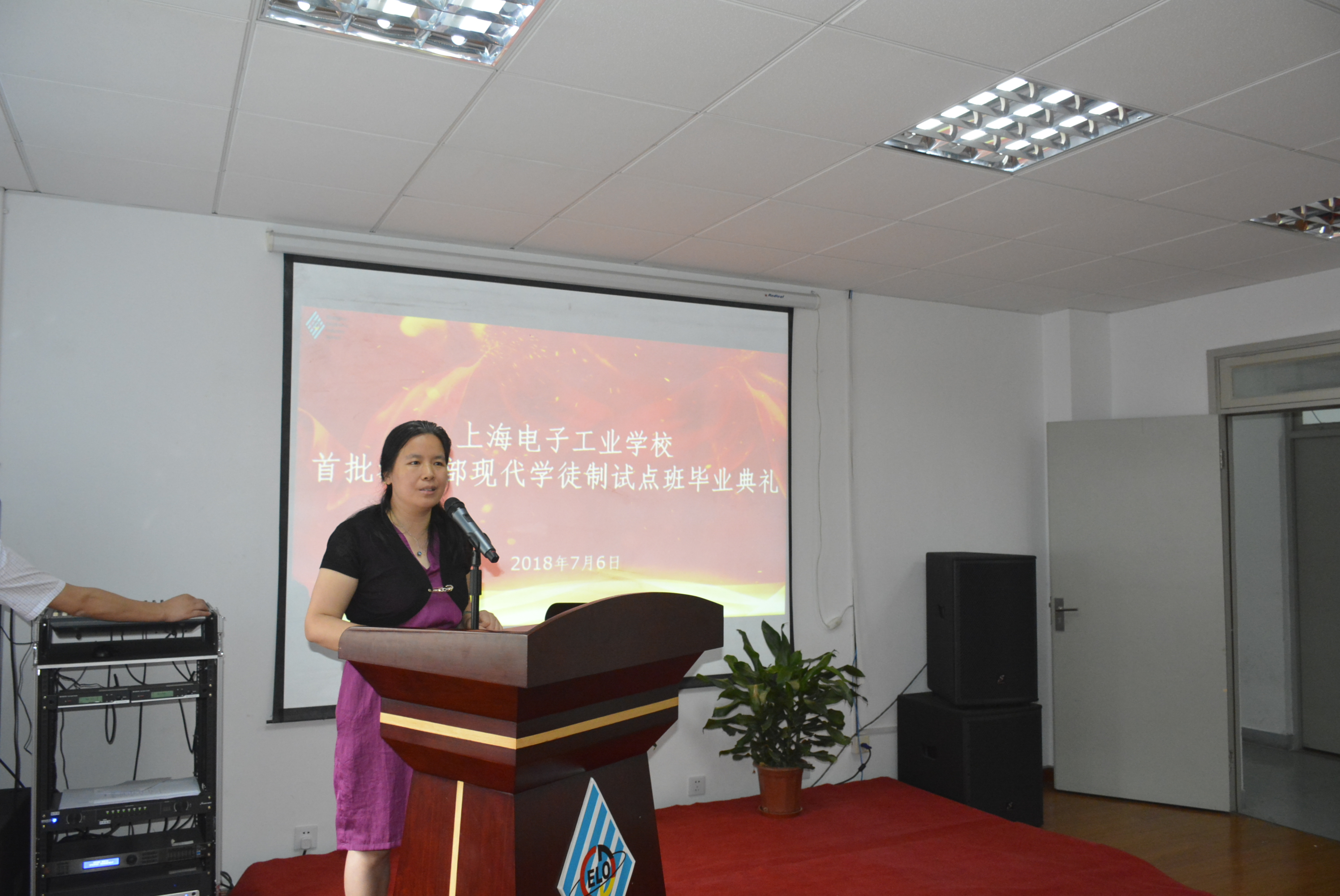 2018年7月6日上午,我校中专部教育部首批现代学徒制试点班毕业生毕业典礼在闵行校区C-211隆重举行。上海市中职校现代学徒制试点项目负责人、上海市教委教研室教研员曾海霞、市教委教研室应宏芳,我院党委副书记、副校长顾剑锋,中专部党政领导、上海松下微波炉有限公司人事经理,以及企业带教师傅、学校教师代表、双元协调科相关人员共同出席毕业典礼,一同见证教育部首批现代学徒制试点班学生顺利学成毕业。