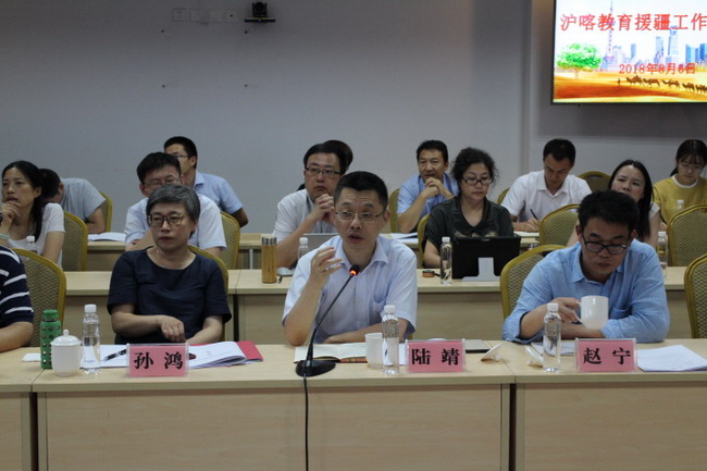 8月6日,杨院长一行参加了在上海援助喀什前方指挥部举行的沪喀教育联盟座谈会。喀什地区行署副专员唐晓冰做了欢迎致辞。会议协调了“万名教师支教计划”(编者:普教系统)、推进沪喀合作建设喀什职业技术学院(筹)等工作。上海市教育委员会陆靖主任总结了一年来上海支援喀什教育开展情况,问询了“万名教师支教计划”双方对接落实情况,并就喀什职业技术学院(筹)下一步工作开展提出了具体建议要求。