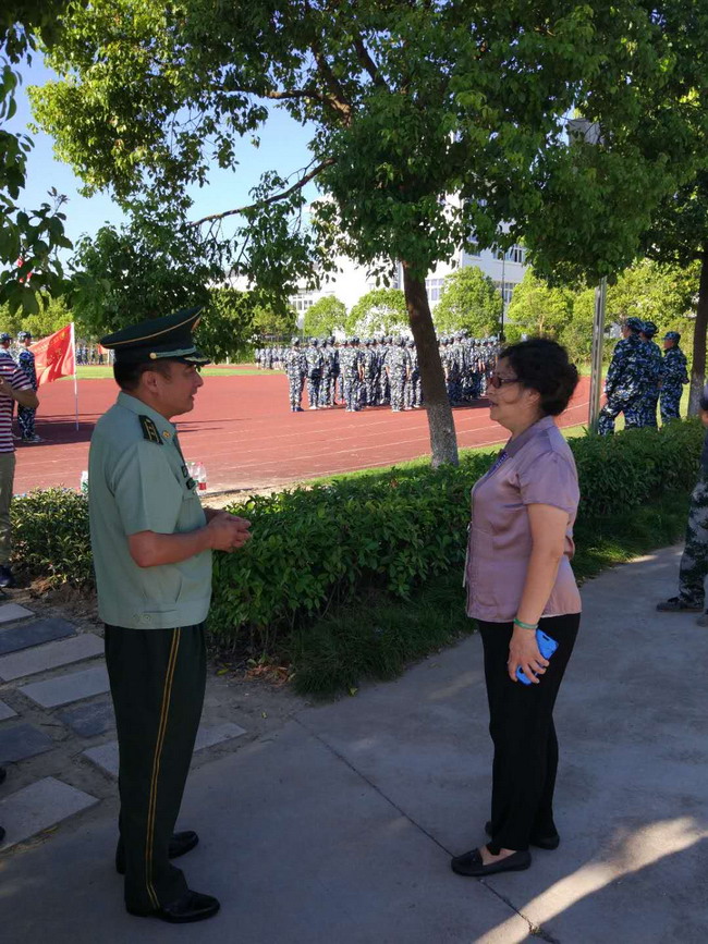 校领导观看了学生的训练,在与军训团团长交流时,嘱咐教官一定要严格要求学生,培养学生艰苦朴素、吃苦耐劳的精神,为以后的学习、生活和成长打下坚实的基础。