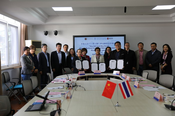 在各院校的见证下,曼谷职教中心、上海电子信息职业技术学院、唐风汉语教育科技有限公司三方共同签署“一带一路”职业教育合作备忘录。(作者:汤艳琦 文 / 周志刚 图  供稿单位:继续教育学院)