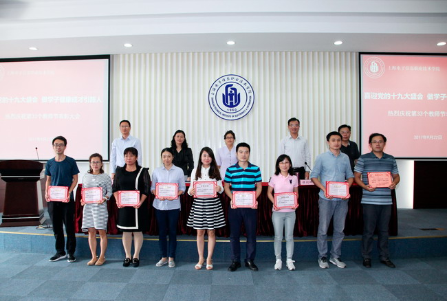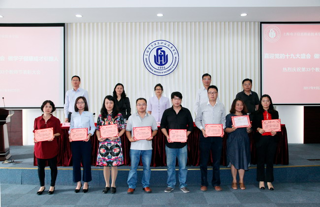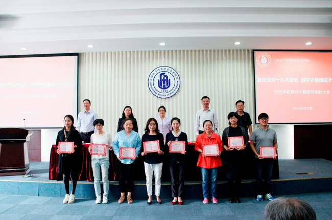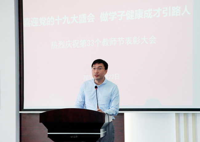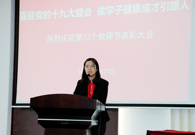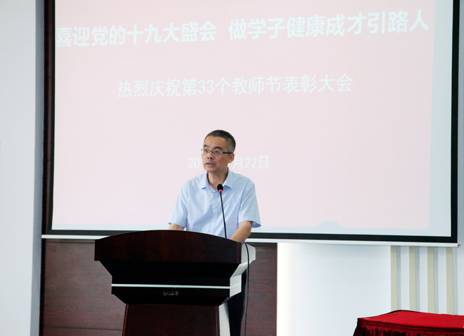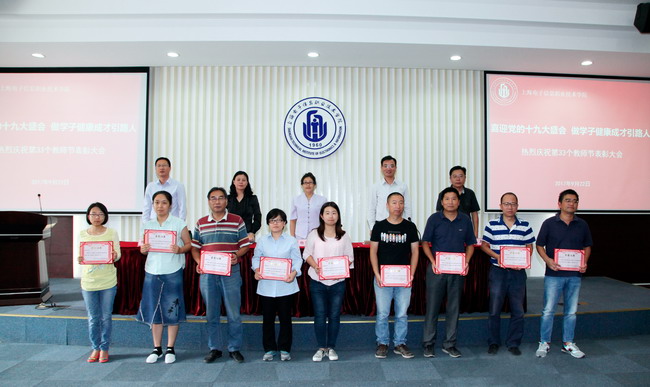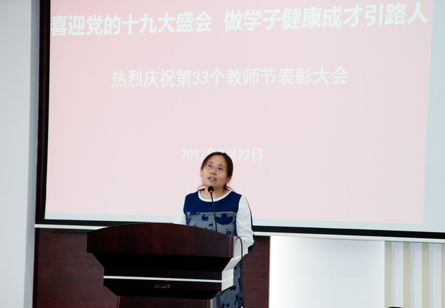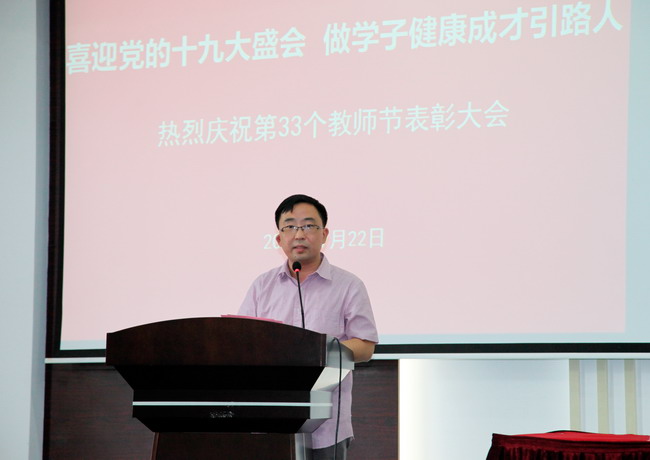 9月22日,学校以“喜迎党的十九大盛会 做学子健康成才引路人”为主题,隆重召开庆祝第33个教师节表彰大会。学校领导杨秀英、顾剑锋、窦争妍、吴依本、张涛和学校教职员工三百余人参加大会。校党委副书记、副校长、工会主席顾剑锋主持大会。