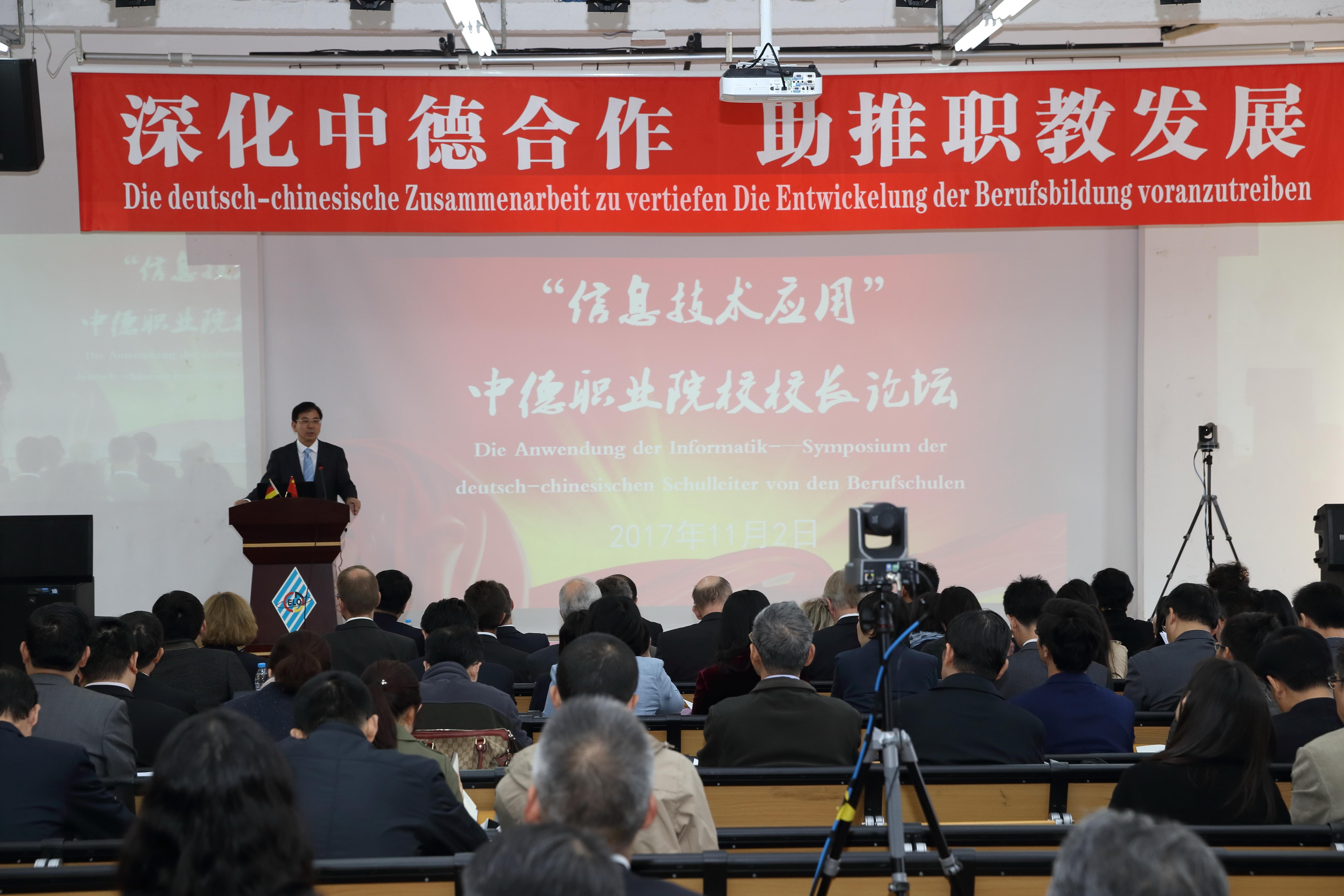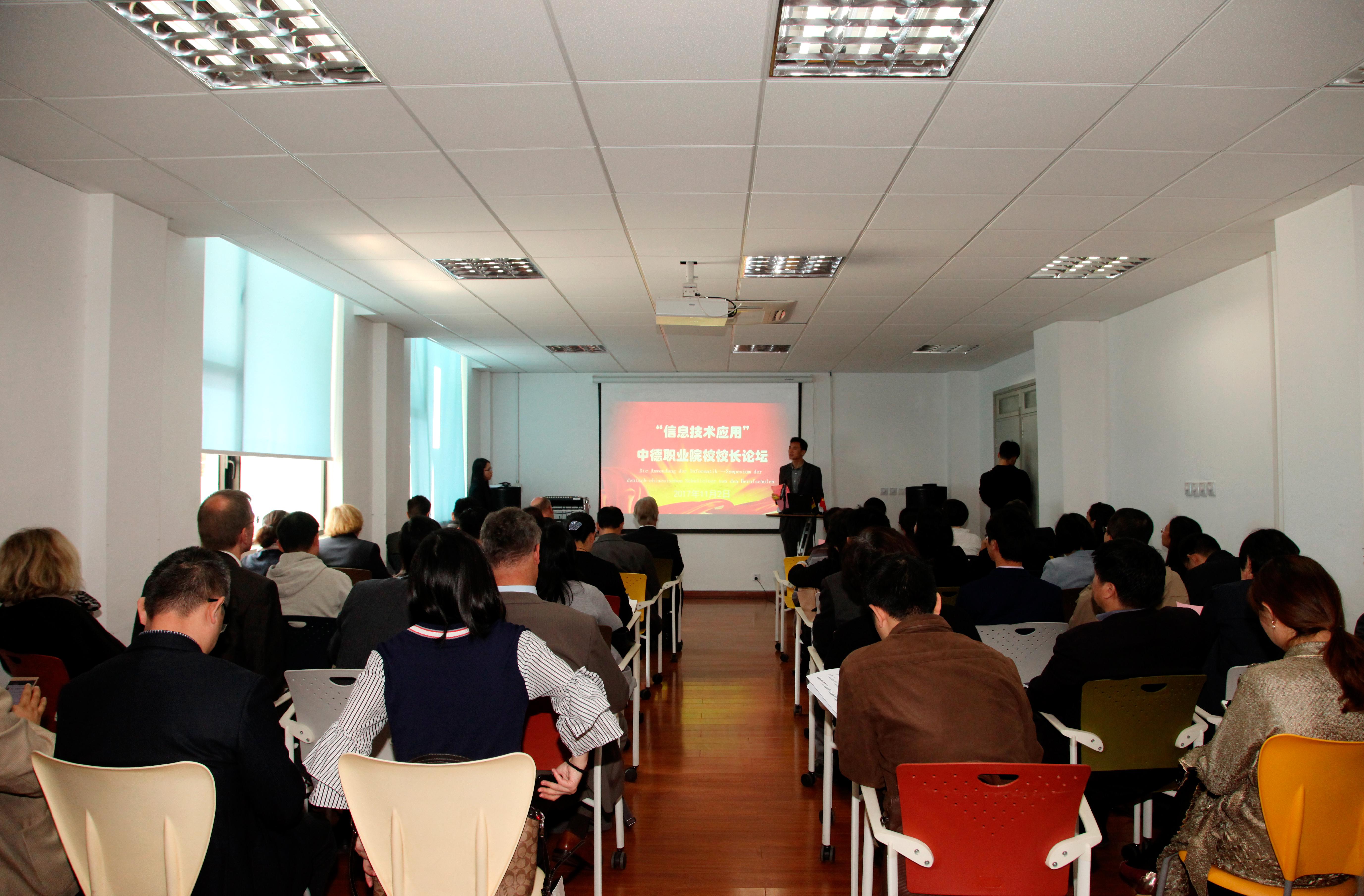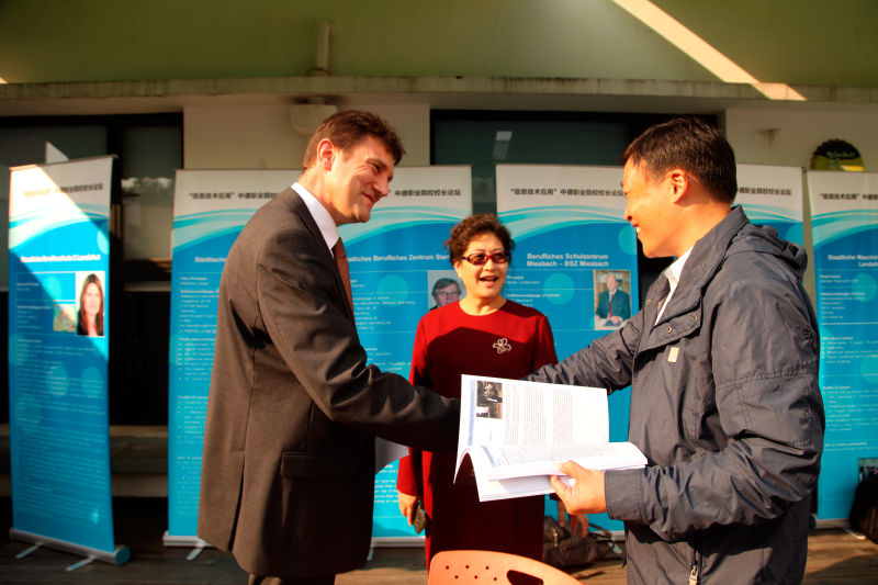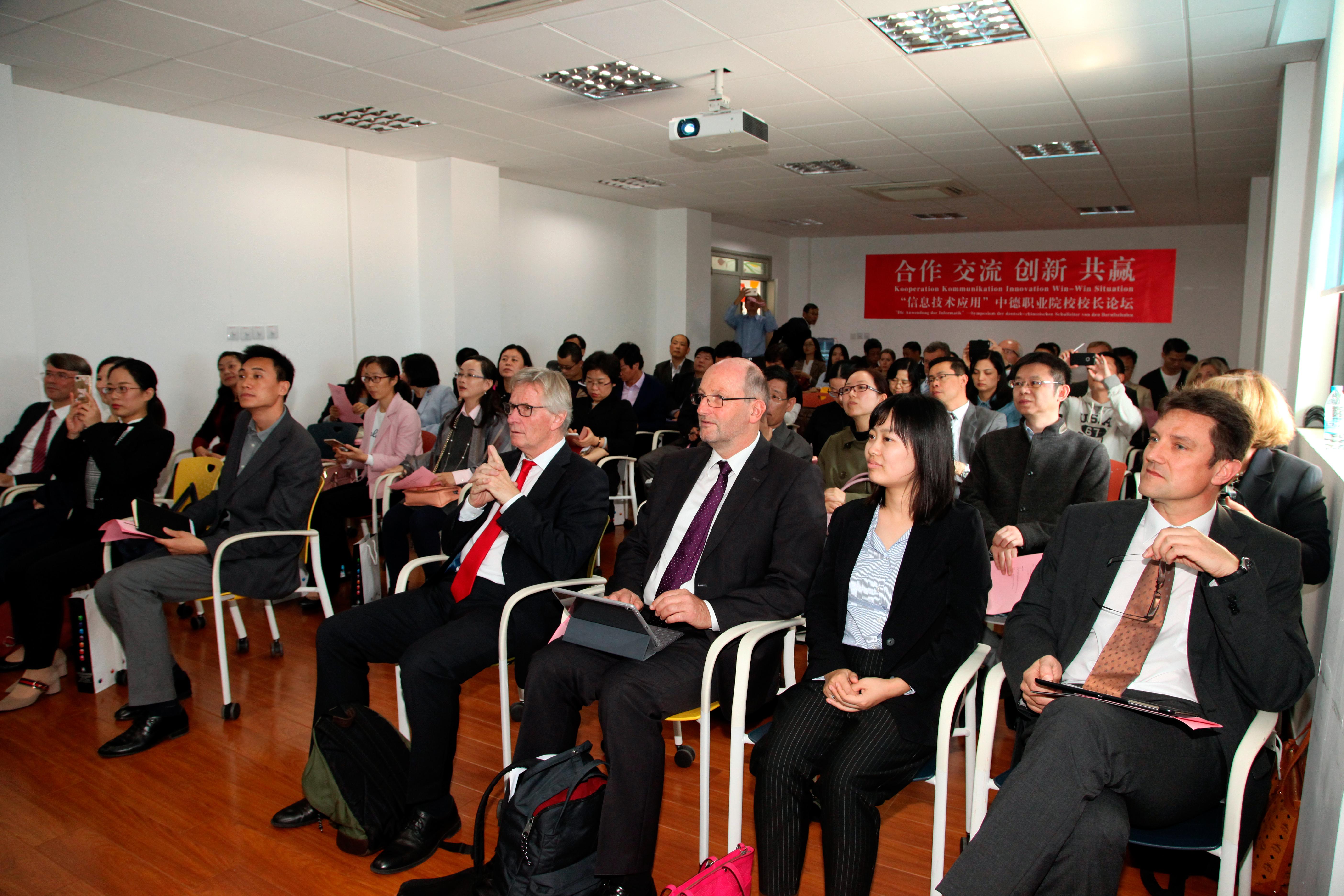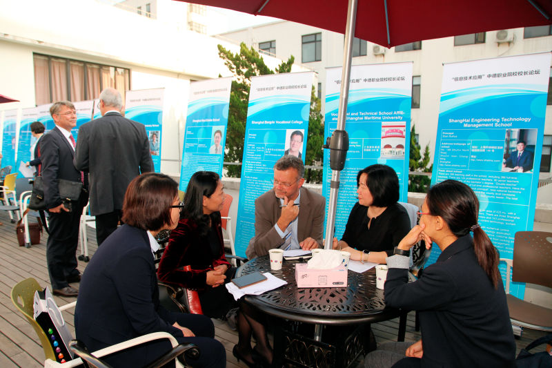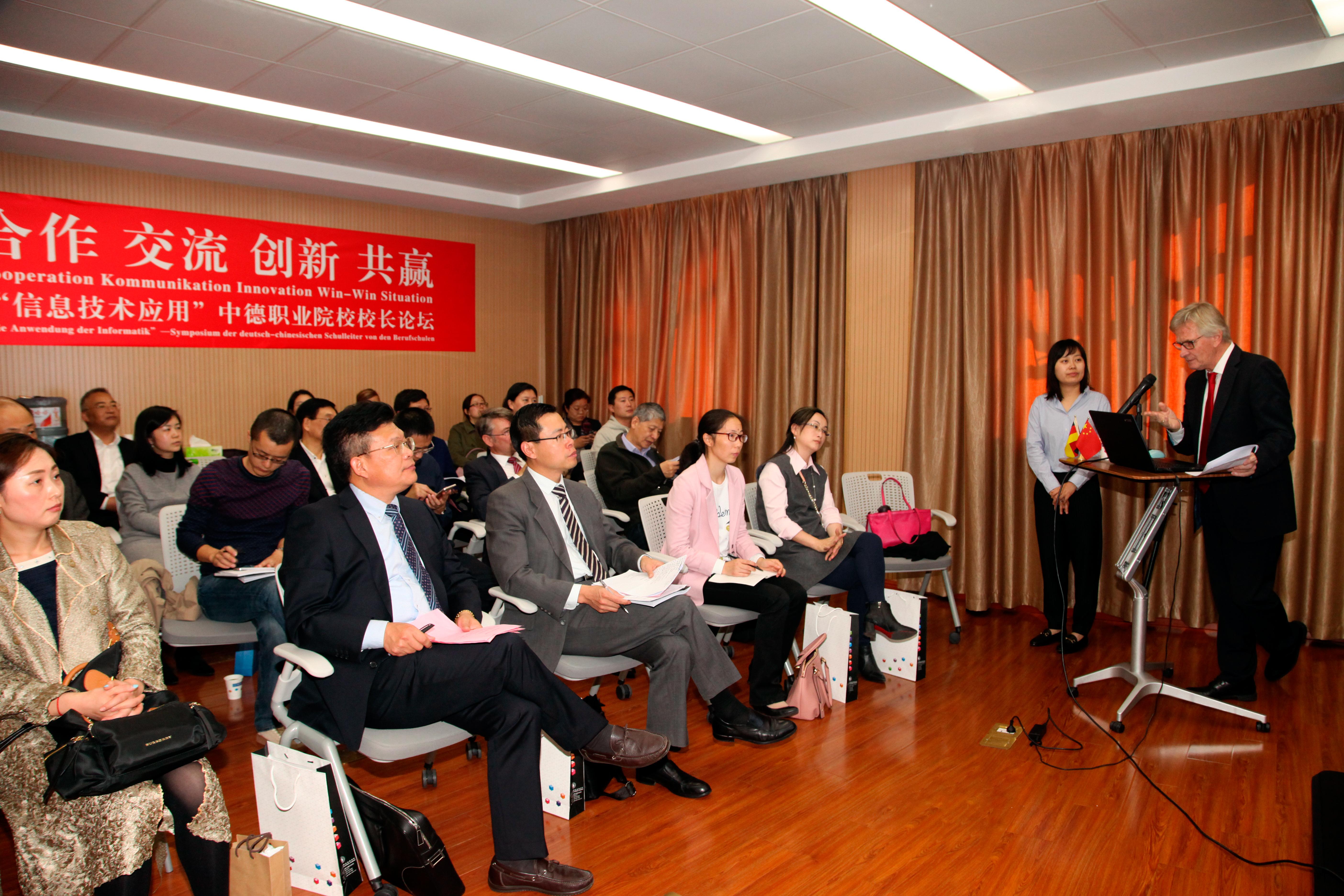 在以“信息技术应用”为主题的中德职业院校校长论坛上,聚焦中国制造2025和德国工业4.0背景下、职业院校如何为工业及社会的信息化转变做准备,围绕“职业院校教育教学”、“校园数字化建设”、“网络电子教学平台建设”及“职业院校教师素养”等四大方面,四位德方校长代表和四位中方校长代表进行了主题发言,并进行了热烈的现场互动讨论。随后,中德双方校长在“找朋友”结对活动环节,寻求合作对象,部分院校当场达成初步合作意向。(傅娟 摄影报道) /p>