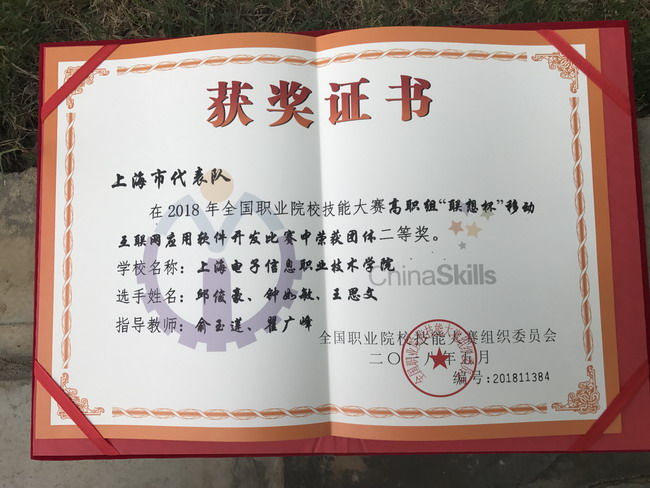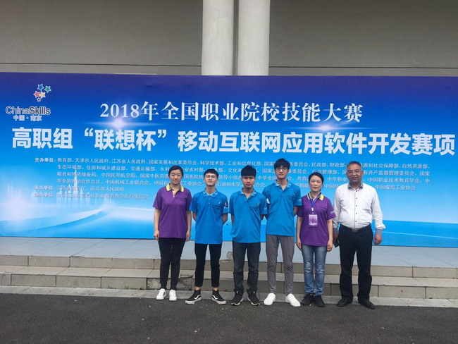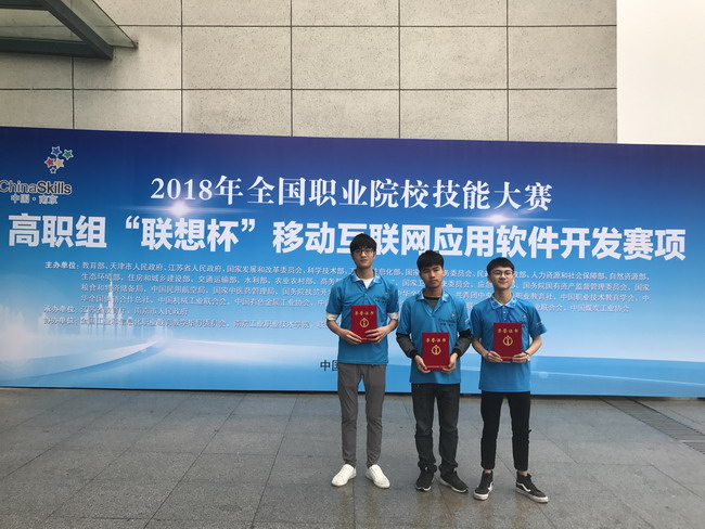 2018年5月22日,在全国职业院校技能大赛南京赛区举行的比赛中,由我校通信与信息工程学院学生邱俊豪、钟如敏、王思文,指导教师俞玉莲、瞿广峰组成的代表队从来自全国的95支参赛队中脱颖而出,获得2018年全国职业院校技能大赛高职组“联想杯”移动互联应用软件开发赛项荣获团体二等奖。