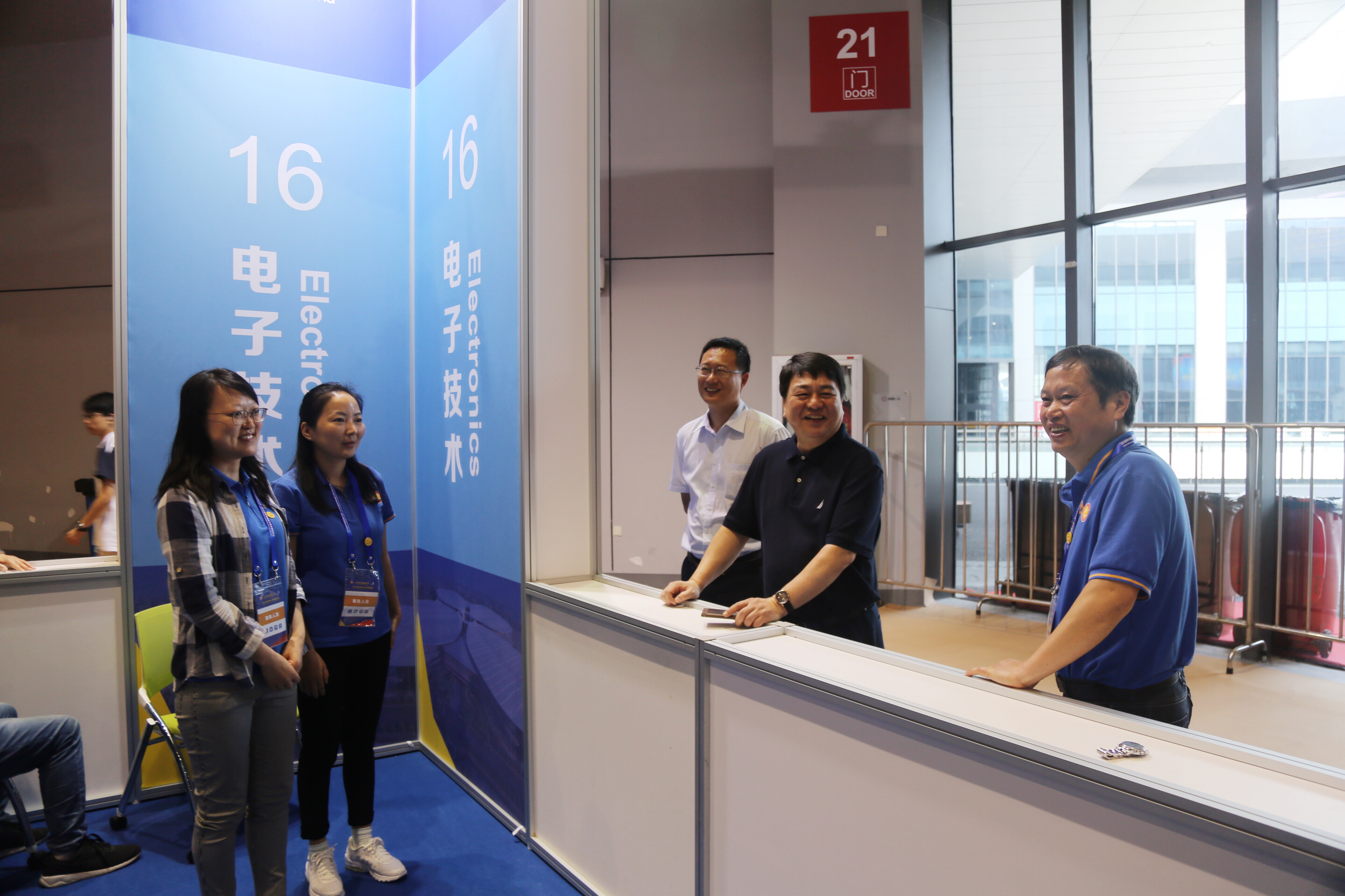 2018年6月13日—6月15日,我校党委书记田钦,党委副书记、副校长顾剑锋,副校长徐德明、副校长张涛先后来到国家展览中心2018年中国技能大赛——第45届世界技能大赛全国选拔赛(上海赛区),来到我校提供技术支持的信息网络布线赛项、电子技术赛项现场,了解赛事进展情况,并看望慰问赛项工作人员。党委副书记、校长杨秀英作为信息网络布线赛项负责人全程在大赛现场为我校参赛学生、现场工作人员“保驾护航”。