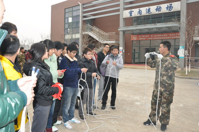 理论课后,系部组织同学们进行了消防现场演练,主要是教会同学们怎样识别灭火器、如何正确使用灭火器、了解灭火器操作安全规程等,此外,童教官还传授了许多非常实用的逃生法,如绳结逃生法等,同学们积极参与、踊跃尝试,现场气氛十分活跃。