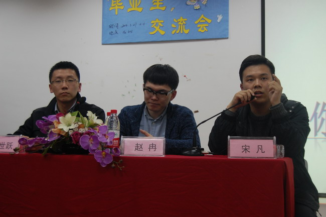 下午4点30分,在H2402教室,2012级和2013级各班班委到场参加交流会。在主持人简短的开场致辞后, 由2010级毕业生孙世跃首先发言,他提出了“良好的沟通可以事半功倍”,紧接着围绕礼节及实习生常见弊病展开话题,期间还多次使用个人经历作为小故事生动地充实他所讲的观点,演讲时他谈吐自然,严谨中又不失幽默,为在座的学生们树立了良好的榜样。接下来,2011级学生会主席赵冉声情并茂地讲述了他的大学生活和个人学习经验,并传授大家实习面试经验和注意事项。他在工作之余,还组建了自己的创业团队,这大大激发了在校学生的创业兴趣。随后,已经参加实习工作的2011级舒海林同学通过精心准备的PPT给在座同学们详细讲解了如何在网络和招聘会上找到合适的工作,工作中会用到的专业技术以及自身专业学习和考证情况。在座的学生深刻地感受到舒海林同学是一个专业技术很强的人。作为多媒体学生工作室的负责人,宋凡同学也是景格企业驻校项目的主管,他的演讲充满激情,工作充满干劲,带领着工作室的学生有规划的进行专业学习,并有效的与企业项目结合。