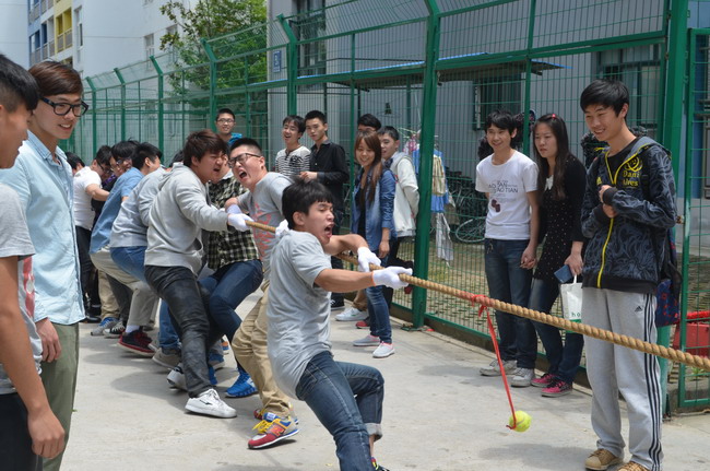 4月8日至5月15日,计算机应用系 “青春正能量”杯拔河比赛在7号楼、8号楼之间道路上如火如荼的进行着。5月15日,拔河比赛进入总决赛阶段,最终由3号楼的12网络3班摘得2012级桂冠、7号楼13网络5班摘得2013级桂冠。两支冠军队于5月19日进行了一场冠军友谊赛,现场气氛热烈,双方奋力拼搏,一度将比赛推到高潮,在宿舍楼上观看的同学们为比赛选手欢呼加油,场面热烈。