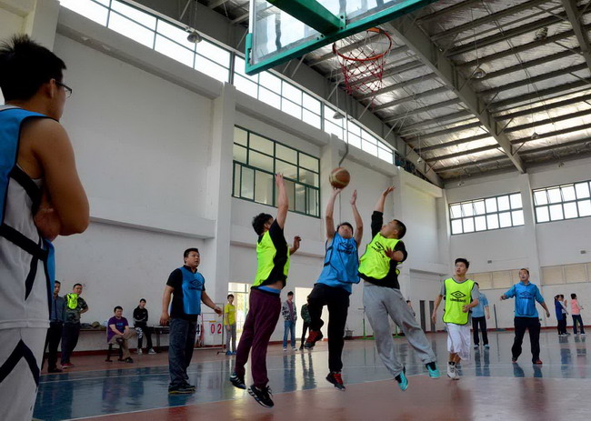 在赛场另一端,男教工三对三篮球赛正热火朝天。比赛打两节,每节打十五分钟。赛场上,大部分教师都没有参加过正规的篮球训练和正式的篮球比赛,可参赛的老师们斗志昂扬,你争我夺,展开了一轮又一轮的投篮、防守。你来我往,进攻、防守、暂停、罚球,再加上场下同学们的助威、呐喊,场面异常火爆。最终行政党支部代表队以22:21微弱的优势赢下了这场比赛。
