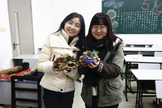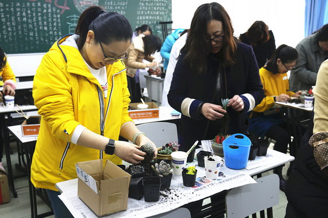 活动当天老师们早早的来到教室,映入眼帘的是各种新奇漂亮的多肉植物和各式漂亮的花盆。首先瞿老师介绍了各种多肉植物的名字和习性,紧接着就如何摆放植物、怎样装饰以及栽培中的注意事项等对老师们进行培训。听完瞿老师的介绍后,老师们跃跃欲试,迫不及待地开始动手设计自己的多肉盆栽。虽然很多老师都是第一次栽培多肉植物,但对于植物的浓厚兴趣弥补了手法上的生疏,不多久,一盆盆创意独特的多肉盆栽展现在大家面前。