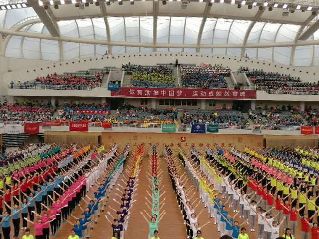上海交大闵行校区的霍英东体育馆欢声雷动、热闹非凡,来自上海市各教育战线的四千余名教育工作者欢聚一堂,尽享运动带来的欢乐,见证规模空前的上海市教工运动会开幕。由我校10名教职工组成的代表队参加了第九套广播体操展演,队形整齐,动作舒展,展示了我校教职工良好的精神风貌。