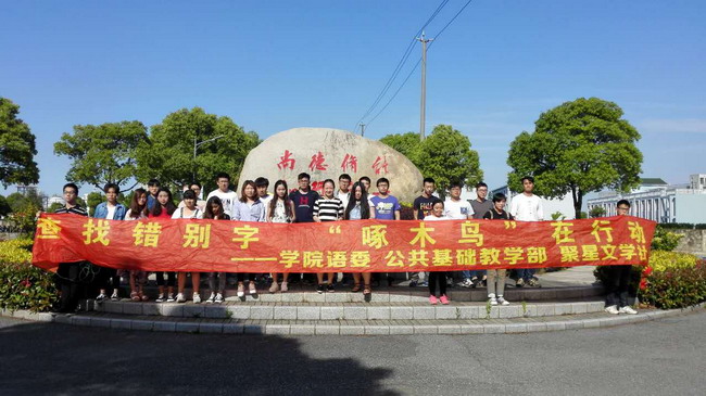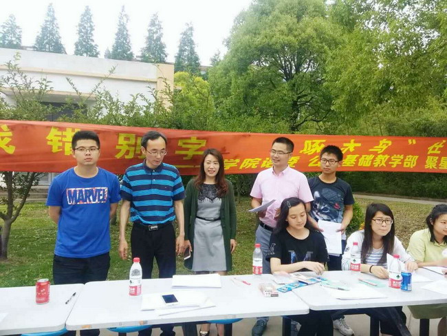 以人文素养课程教改为抓手,开展各类语文课程实践活动。公共基础学院创新以《大学语文》课程活动实践为载体,注重学生人文素养与职业能力结合,将做人教育与做事教育融为一体,大力倡导对学生进行“全人教育”,致力于学生健全人格的培养。以5月底启动开展的“查找错别字,‘啄木鸟’在行动”活动为例,从组建学生团队,起草活动《策划书》、《倡议书》,制作宣传海报、横幅,编撰调查问卷,到组织实施校园语言文字环境考察活动,起草撰写《关于不规范使用语言文字的情况调查报告》,大量细致入微的工作全部由《大学语文》选修班级学生独立完成。到目前为止,20余名学生深度参与、持续开展长达1个月的“啄木鸟”实践活动,以手机拍照的形式,搜寻、查找并锁定了校内120余处错别字等不规范语言文字现象。正在修改完善的调查报告也将适时提供给校方决策参考。