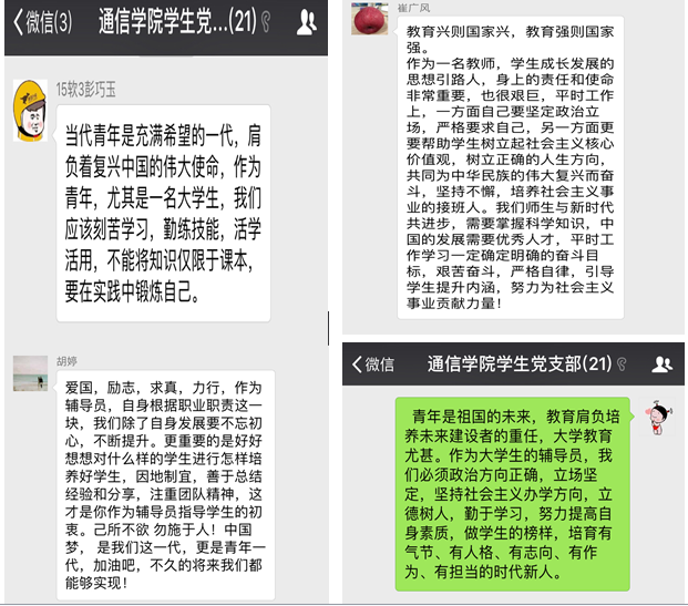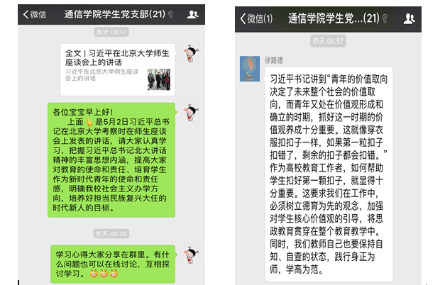 为深入学习领会习近平总书记“五四”重要讲话精神的丰富思想内涵,增强广大师生党员的使命感和责任感,5月4日至14日,通信学院党总支指导各党支部开展了形式多样的学习交流活动。教工第一党支部以分党小组的形式开展学习,并召开支部大会安排各党小组代表发言交流,分享学习心得和体会。教工第二党支部通过召开党员大会集中学习,带领党员学习了讲话全文,党员们结合自身工作实际发表了学习感想。学生党支部则结合青年师生特点和习惯,采用微信平台进行交流学习,在线开展讨论。