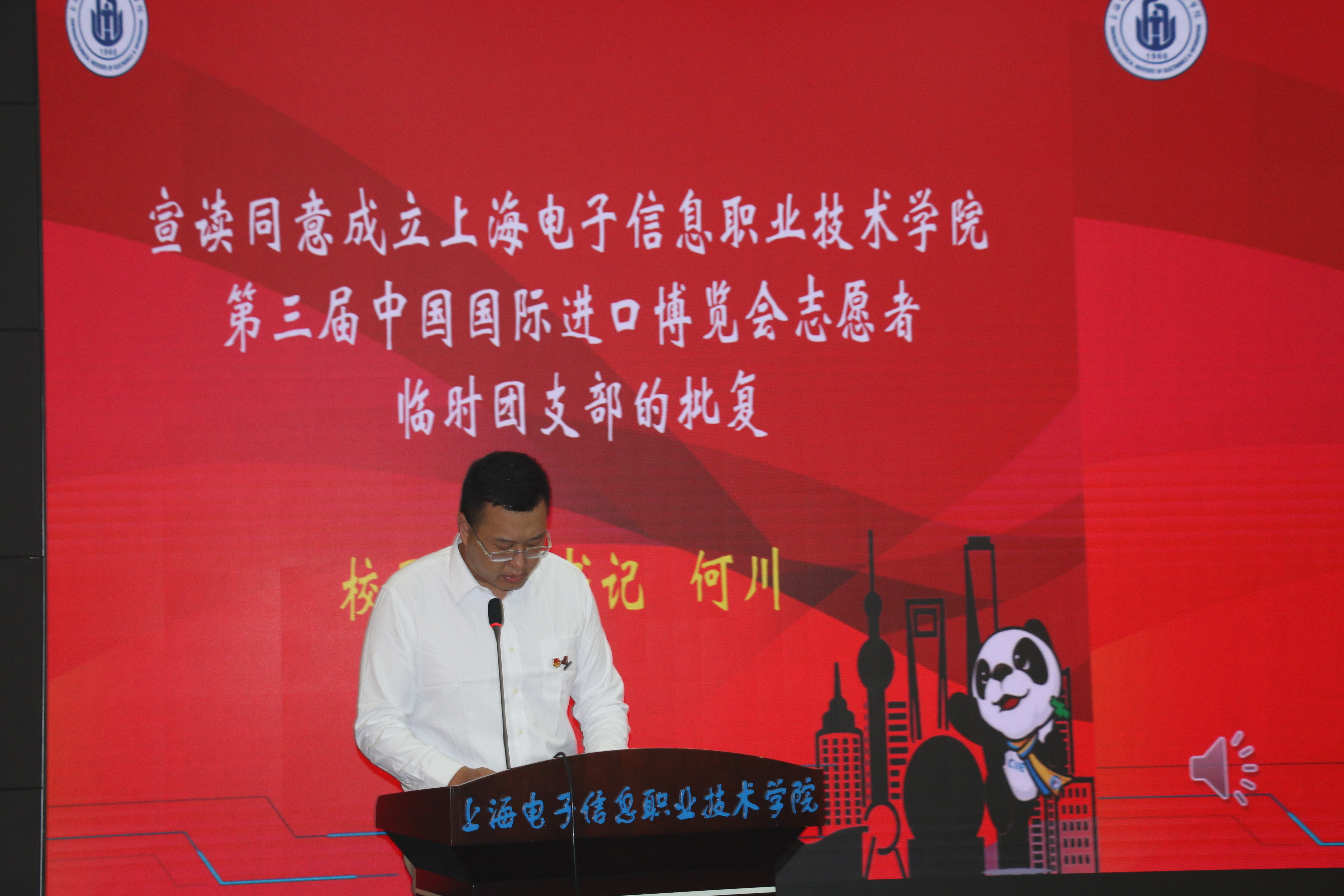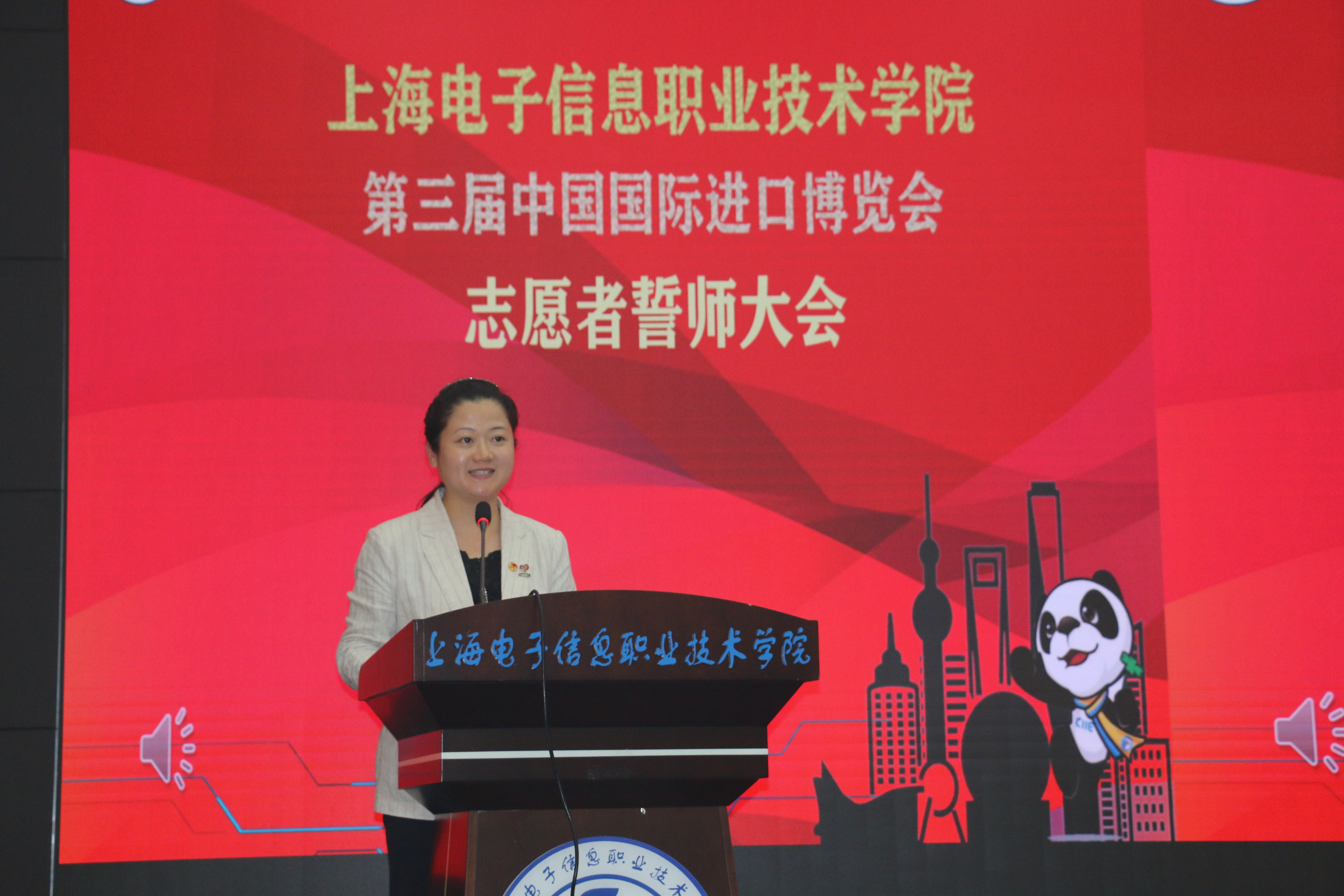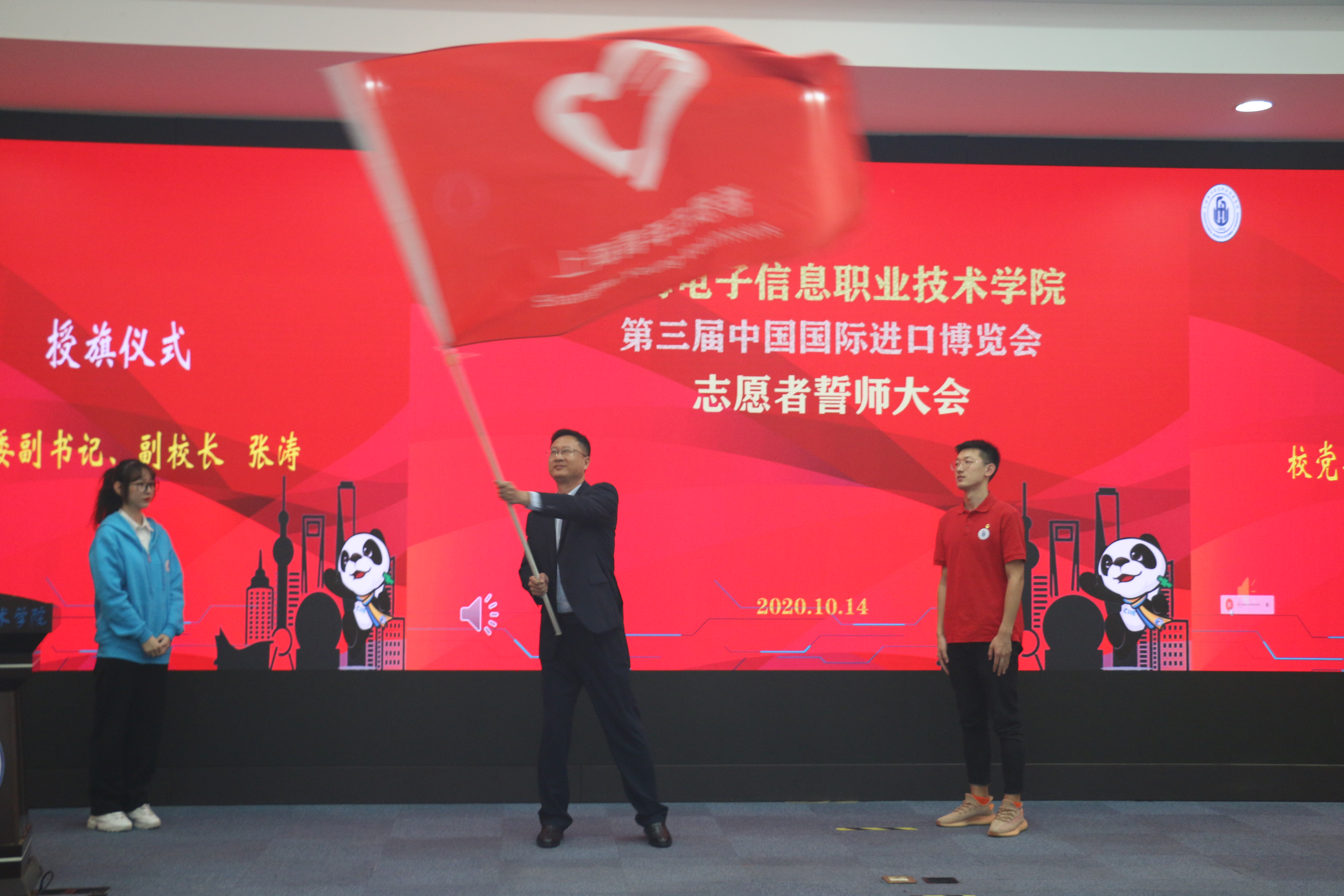 阳光十月,东海之滨,白鹭飞舞,展翅长空。2020年10月14日,在喜迎60周年校庆之际,为确保第三届进博会志愿服务的顺利开展,学校在中德C楼108报告厅隆重举行上海电子信息职业技术学院第三届中国国际进口博览会志愿者誓师大会。学校党委书记田钦,校党委副书记、副校长张涛出席本次大会,各二级学院分管学生工作的领导,校团委,二级学院团总支书记及负责人,“小叶子”们参加本次大会,会议由校团委书记蔡林洁老师主持。