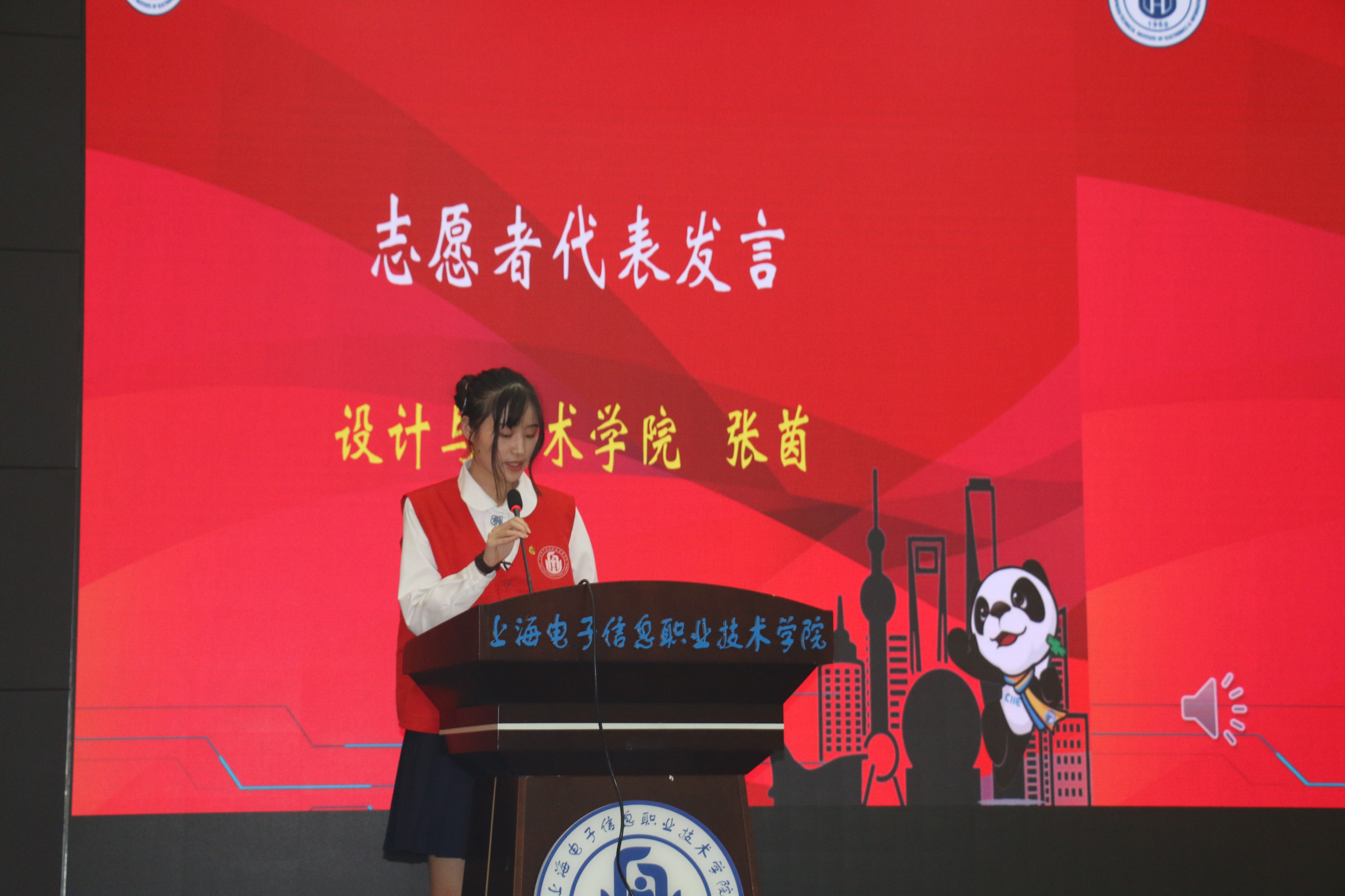 在观看完进博会志愿者宣传视频后,大会在庄严的国歌声中拉开帷幕。首先由校团委副书记何川宣读成立上海电子信息职业技术学院第三届中国国际进口博览会志愿者临时团支部的决定。随后,在校团委胡婕老师的带领下,全体同学重温了入团誓词。来自设计与艺术学院的张茵同学作为进博会志愿者代表发言。她分享了对于进博会的理解和认识,结合自己的志愿服务经历,指出了志愿服务的要义,阐释了知行合一的重要意义,并代表全体志愿者表态,将以积极的态度、饱满的热情,认真严谨的完成服务工作,展现新时代青年大学生风采。