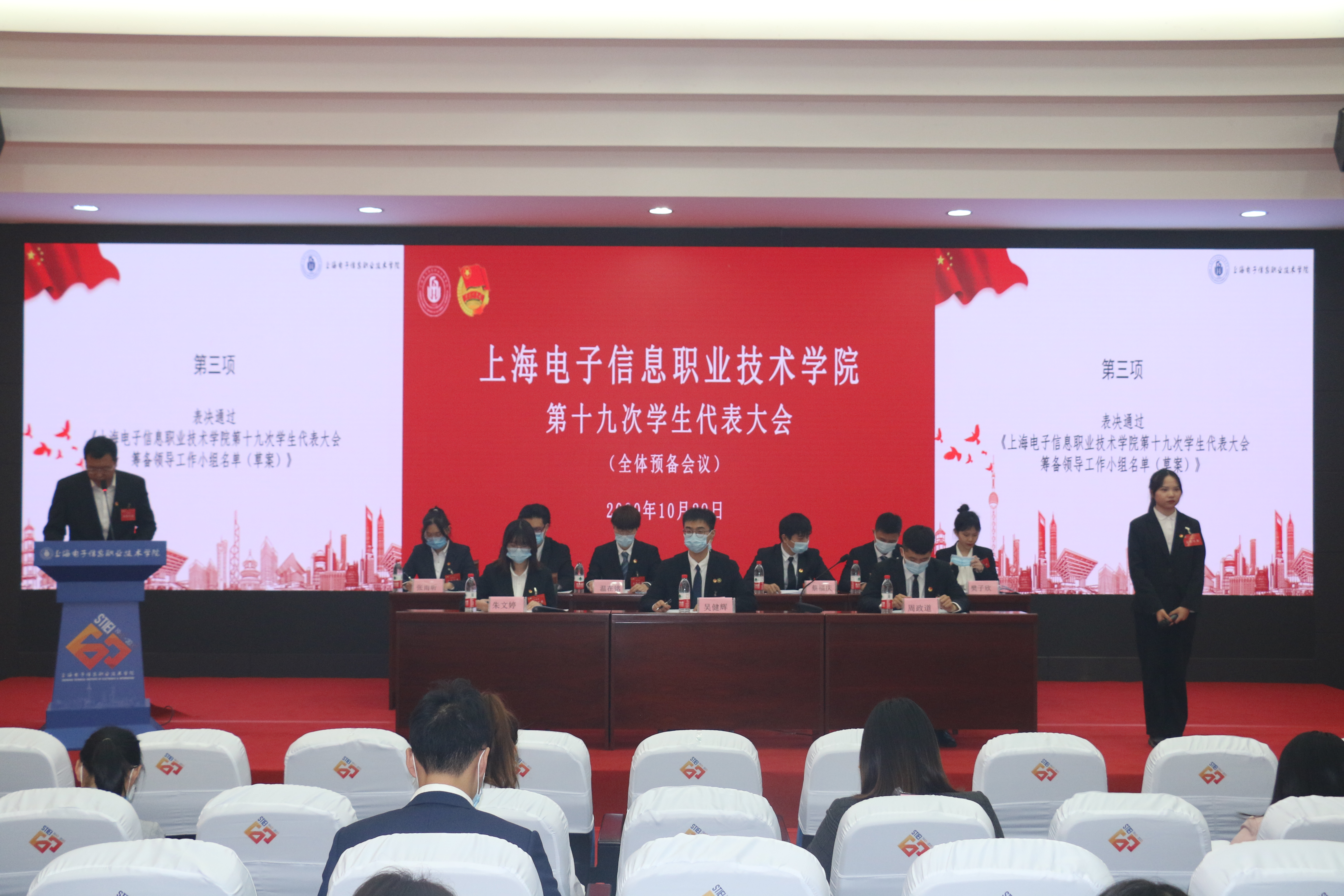 全体预备会议由学校团委副书记、学生会秘书长何川主持。会议首先审议通过了《上海电子信息职业技术学院第十九次学生代表大会表决办法(草案)》,随后表决通过了《上海电子信息职业技术学院第十九次学生代表大会代表资格审查报告(草案)》、《上海电子信息职业技术学院第十九次学生代表大会筹备领导小组名单(草案)》、《上海电子信息职业技术学院第十九次学生代表大会筹备工作组名单(草案)》、《上海电子信息职业技术学院第十九次学生代表大会主席团名单(草案)》、《上海电子信息职业技术学院第十九次学生代表大会秘书长名单(草案)》、《上海电子信息职业技术学院第十九次学生代表大会学生常任代表委员会候选人名单(草案)》、《上海电子信息职业技术学院第十九届学生会主席团正式候选人名单(草案)》,并听取了《上海电子信息职业技术学院第十九次学生代表大会筹备工作报告》。