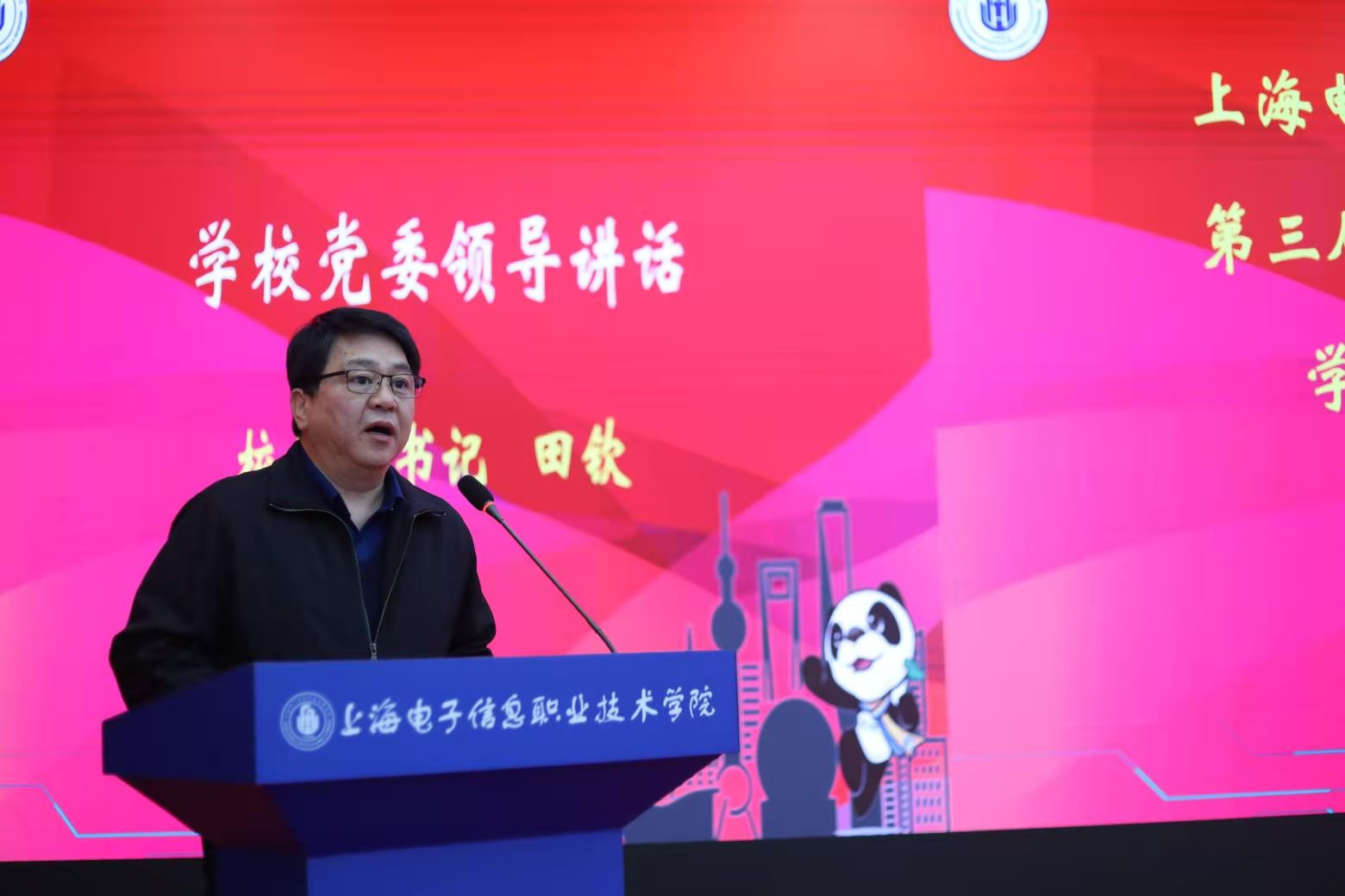 最后,学校党委书记田钦在大会上发表讲话,他指出,我校110名“小叶子”首次亮相进博,展现出多元的电子信息学子风采,交出了一份成绩斐然的青春答卷。电子信息“小叶子”们甘当绿叶的精神和勇于奉献的责任意识,凸现“尚德修能,知行合一”的校训,为全体小叶子点赞。同时他也对全体同学提出两点希望:一是希望我们从历史文化中涵养气度、拓展气度,认真学习“四史”。在历史中汲取精神力量、汲取经验智慧、汲取坚守人民立场的定力,提高文化修养和思想素质,真正成为德才兼备的人才。二是希望我们继续保持进博会志愿服务期间的活力,珍惜大学学习机会,努力打牢知识基础,培养严谨学风,继续拓展世界眼光,学习各种新知识新技能,使自己的知识结构适应时代的要求,不断增强为国家和人民服务的本领,成为中华民族接班人,努力为实现中国梦而奋斗,为两个“一百年”奋斗目标而努力。