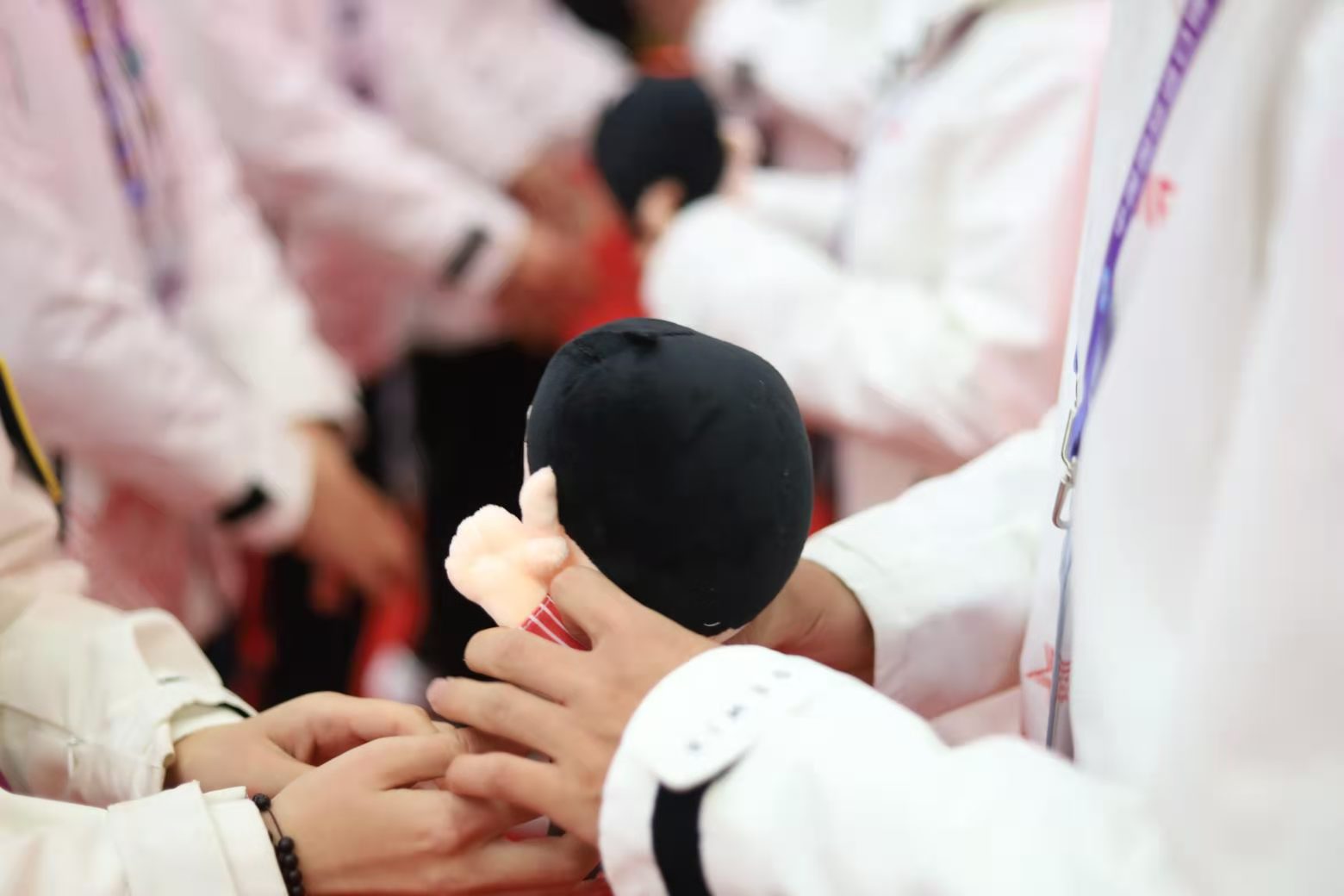 然后,来自外语学院的刘政同学作为优秀志愿者标兵代表发言,接着,会期志愿者向储备志愿者赠送进博会志愿者形象文创品。