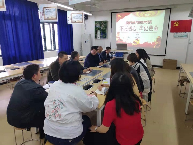 教师第二党支部组织党员在J313会议室集中学习《习近平关于“不忘初心、牢记使命”论述摘编》,党员们各自领读了第三章中自己最有感想的段落,并紧紧围绕“用新时代中国特色社会主义思想铸魂育人”主题,结合本职工作交流了学习体会。
